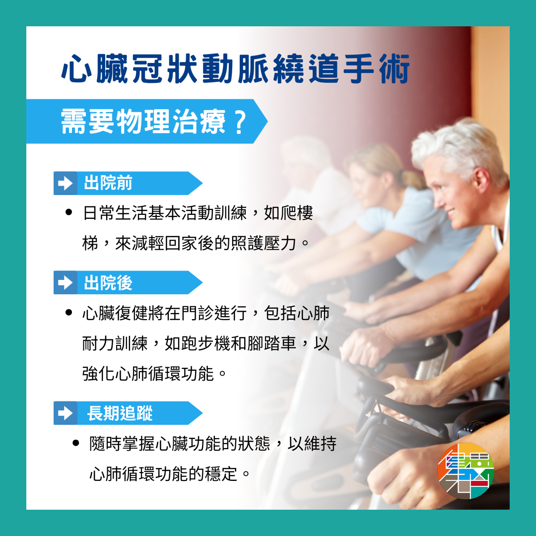 ➡️出院後:心臟復健將在門診進行,主要是心肺耐力訓練,如跑步機和腳踏車,同時監測心跳、血氧和血壓,以強化心肺循環功能。