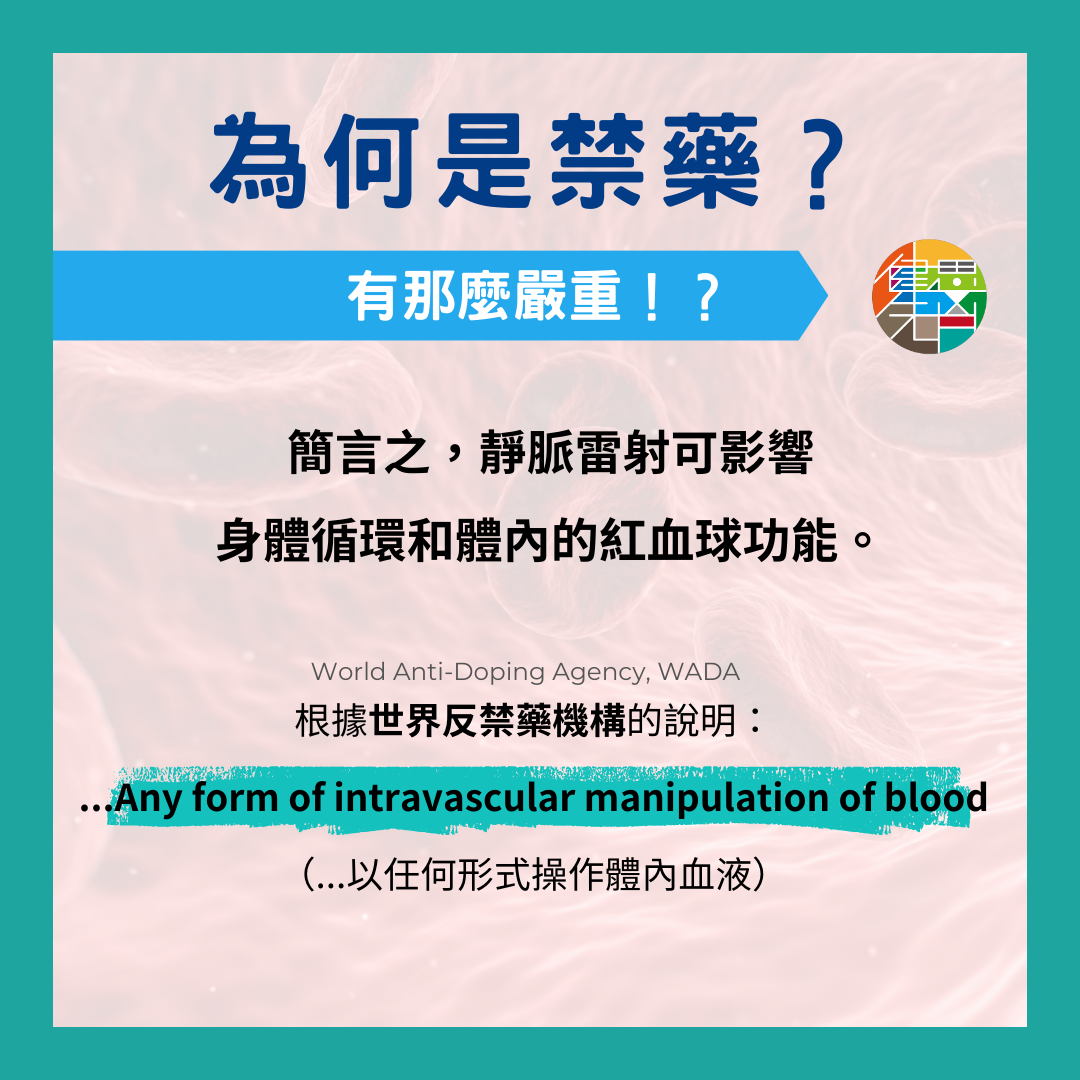 靜脈雷射是可以影響我們身體循環和體內的紅血球功能。而根據世界反禁藥機構(World Anti-Doping Agency, WADA)所羅列的禁藥列表中,靜脈雷射是禁止項目之一,理由就是其特性的「...以任何形式操作體內血液」(...Any form of intravascular manipulation of blood)*。