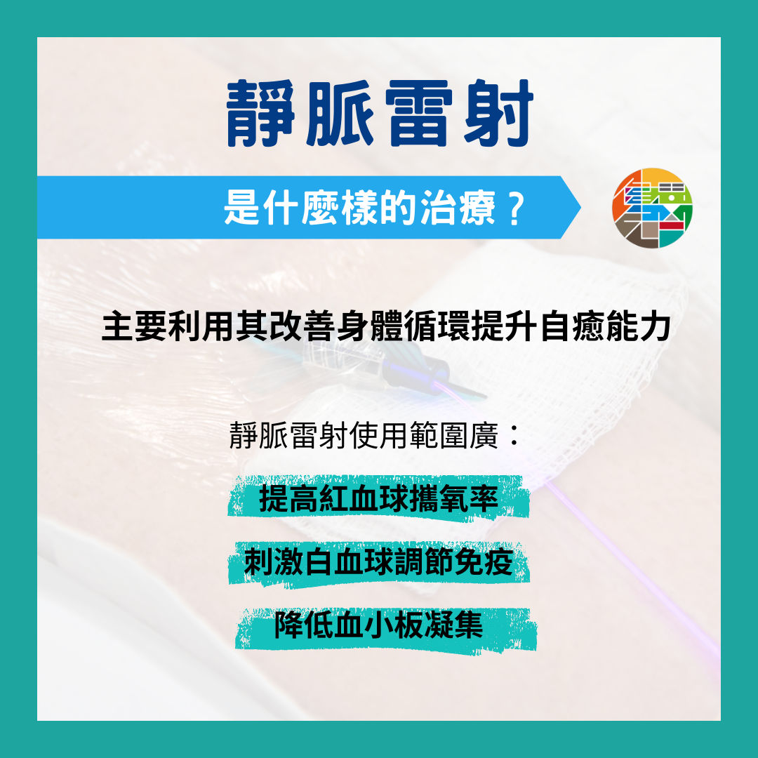 透過靜脈雷射可以 1). 提高紅血球攜氧率、2). 刺激白血球調節免疫,以及 3). 降低血小板凝集而改善血液流動性等。