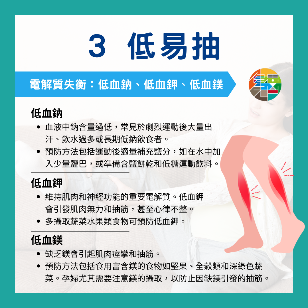 預防抽筋的關鍵在於維持電解質平衡,特別是血鈉、血鉀和血鎂的正常水平。這三種電解質的不足,容易引發抽筋,故稱為「#3低易抽」。