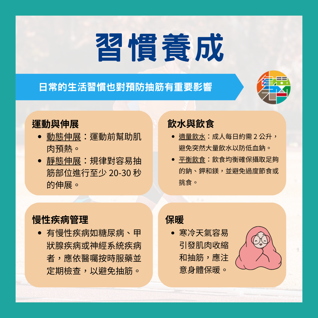 ➡️ 慢性疾病管理:有慢性疾病如糖尿病、甲狀腺疾病或神經系統疾病者,應依醫囑按時服藥並定期檢查,以避免抽筋。