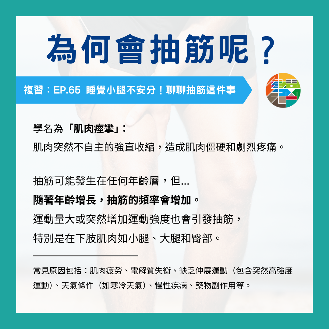 (複習:Ep.65 睡覺小腿不安份!聊聊抽筋這件事)抽筋的醫學名稱是「#肌肉痙攣」,指的是肌肉突然不自主的強直收縮,造成肌肉僵硬和劇烈疼痛。抽筋可能發生在任何年齡層,特別是隨著年齡增長,抽筋的頻率會增加。運動量大或突然增加運動強度也會引發抽筋,特別是在下肢肌肉如小腿、大腿和臀部。