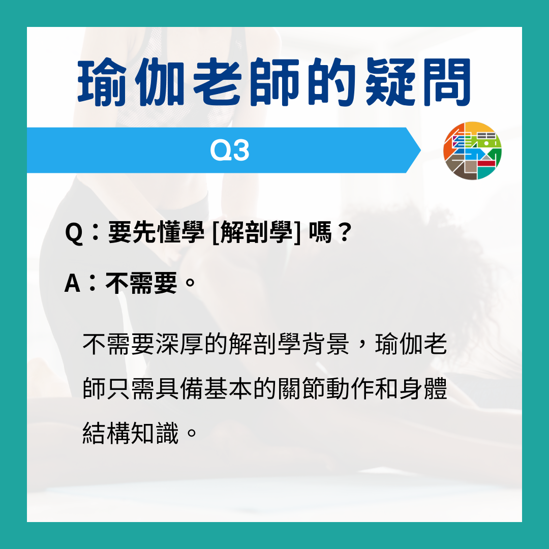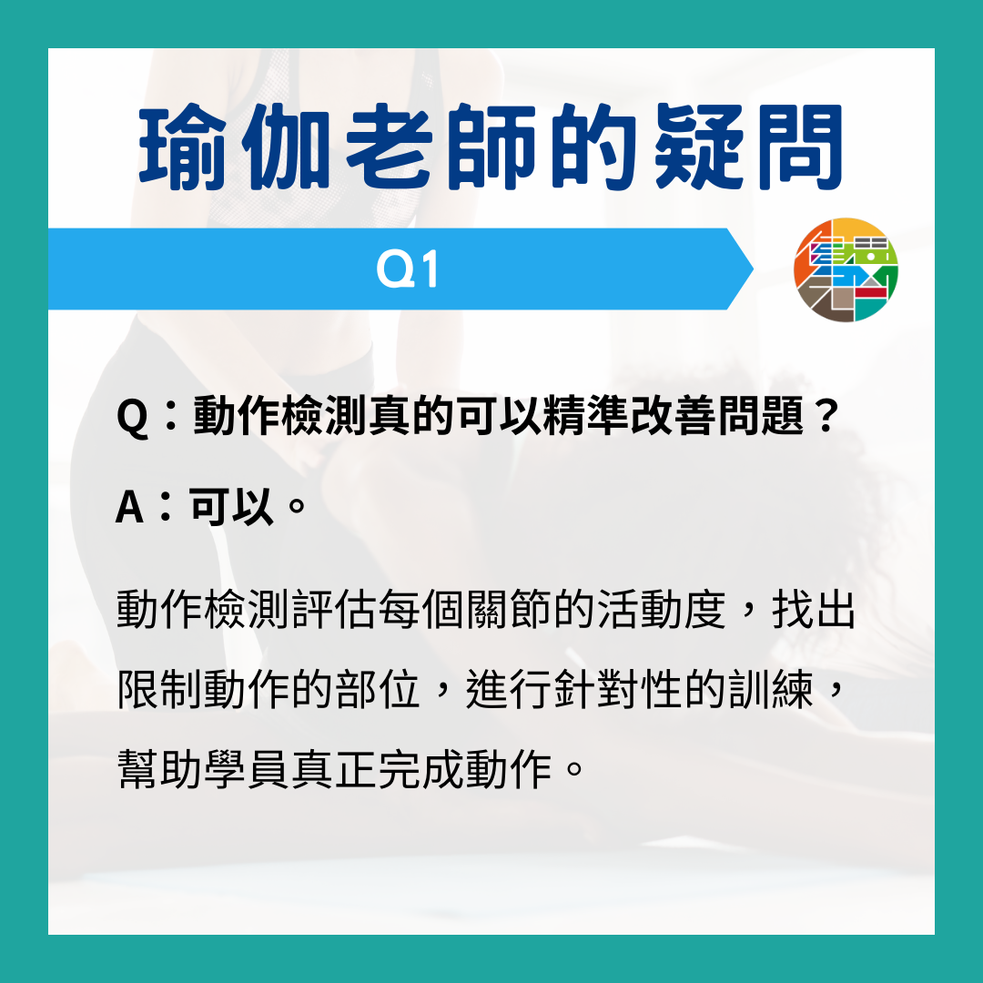 A:放心~不需要深厚的解剖學背景。瑜伽老師都具備一定的相關知識,例如基本的關節動作和身體結構。若加以複習、補充相關資訊,更能幫助吸收動作檢測的知識。