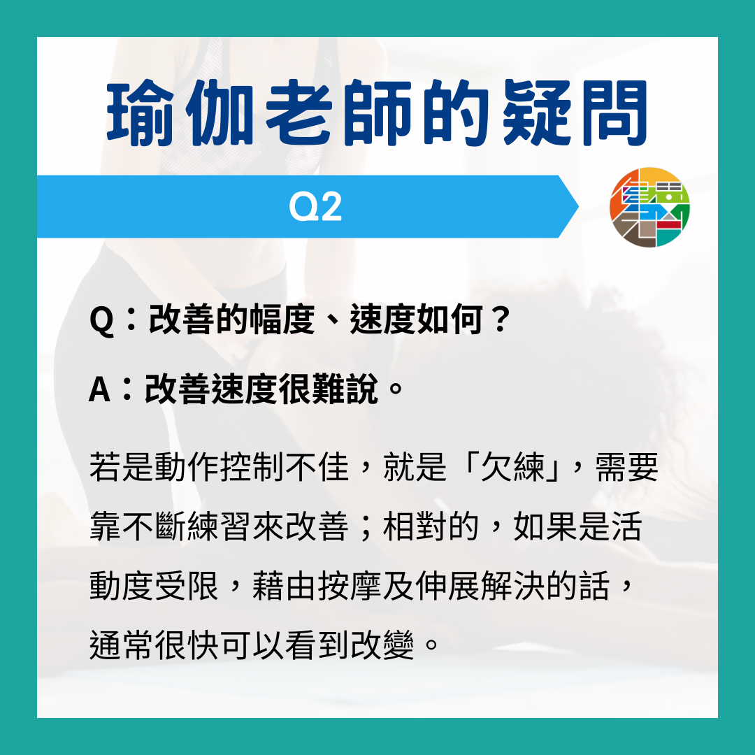 A:改善速度很難說。如果是只是因為控制不佳,就是「欠練」,需要靠不斷練習來改善,伸展按摩就不會有什麼幫助;相對的,如果是找到活動度受限的原因,能夠藉由按摩及伸展解決的話,通常很快可以看到改變。