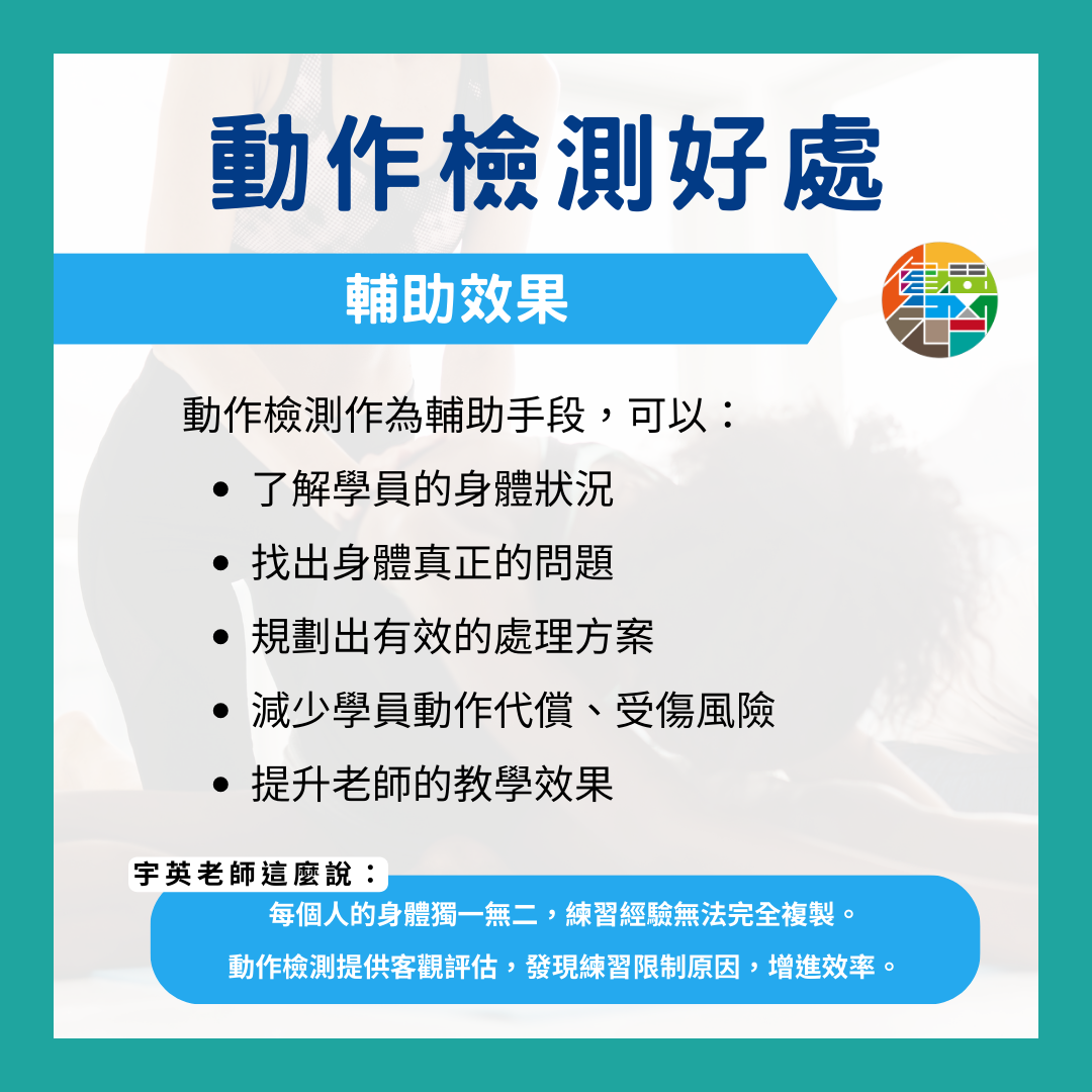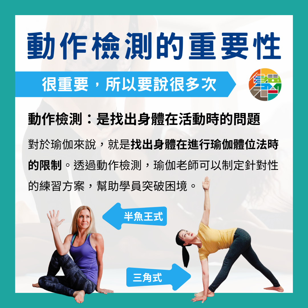 而對於瑜伽來說,就是找出身體在進行瑜伽體位法時的限制。特別是當練習者無法順利完成某個體位法,就必須找出到底問題是「欠練」還是「欠伸展」。透過動作檢測,瑜伽老師可以更加容易找出問題點,並制定針對性的練習方案,幫助學員突破長久的困境。