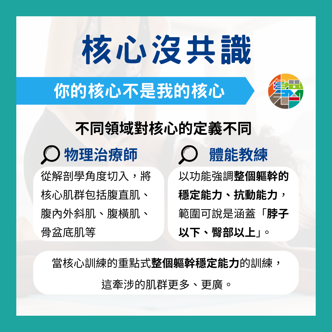 體能教練則以功能性角度看待核心訓練,強調整個軀幹的穩定能力,範圍可以說是涵蓋了「脖子以下、臀部以上」。重點在於 #核心的抗動能力,認為在各種運動中,軀幹的穩定性和協調性是關鍵。