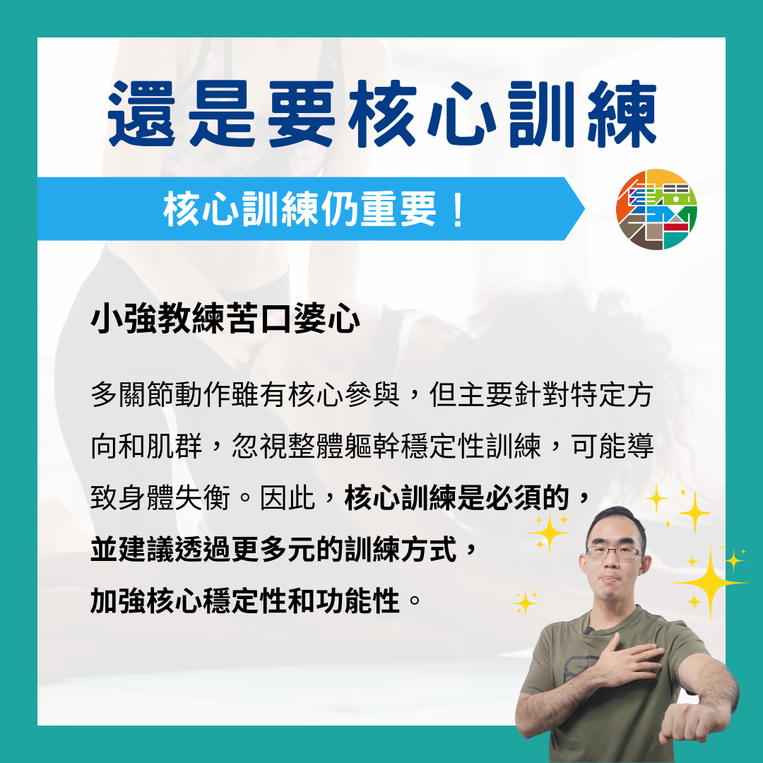 總結來說,專注練核心並非浪費時間。雖然深蹲、硬舉等多關節動作都有核心的參與,但這些訓練主要針對特定方向、特定肌群,而忽視整體軀幹穩定的肌群鍛鍊,而可能導致身體失衡。