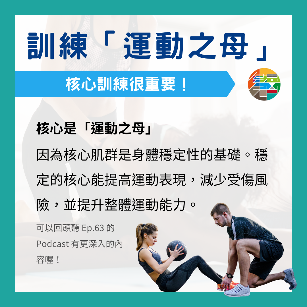 核心訓練可以說是「運動之母」,這是因為核心肌群是身體穩定性的基礎。穩定的核心可以提高運動表現,減少受傷風險。透過強化核心,身體在各種動作中能保持平衡和協調,進而提升整體運動能力。(複習 Ep. 63重視你的運動之母)