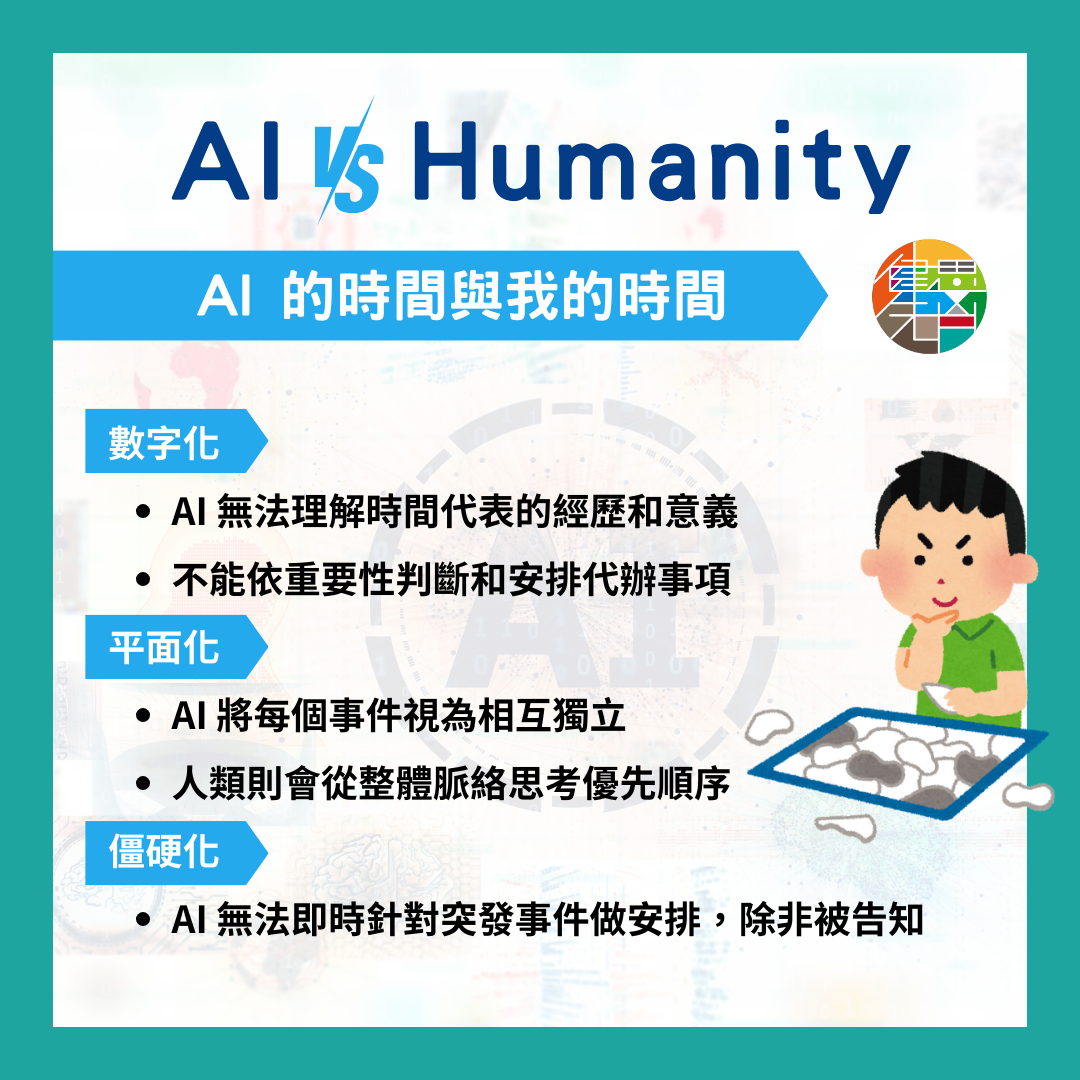 數字化:人類經歷時間不僅是時針、分針的推動,而是感知到每件事的意義以及過程中所產生的感受。AI 目前無法理解數字 30 分鐘對於使用者所代表的經歷和意義,進而無法為使用者依重要性來判斷和安排代辦事項。