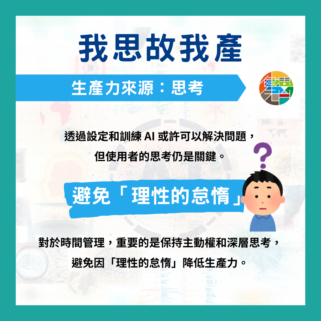 工具本身沒有問題,重點是使用的人,如果丟給 AI 做時間管理,少了自身的思考,最終可能會因「理性的怠惰」而導致生產力低落。