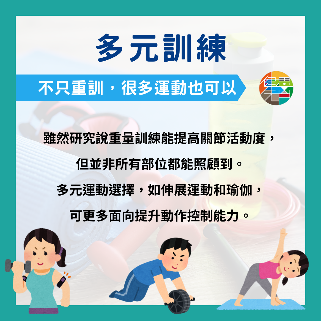 其實,除了重訓,可以考慮更多元方式來增進自己的身體控制能力和關節活動度,加入伸展或瑜伽等運動,多面向提昇身體的活動度。