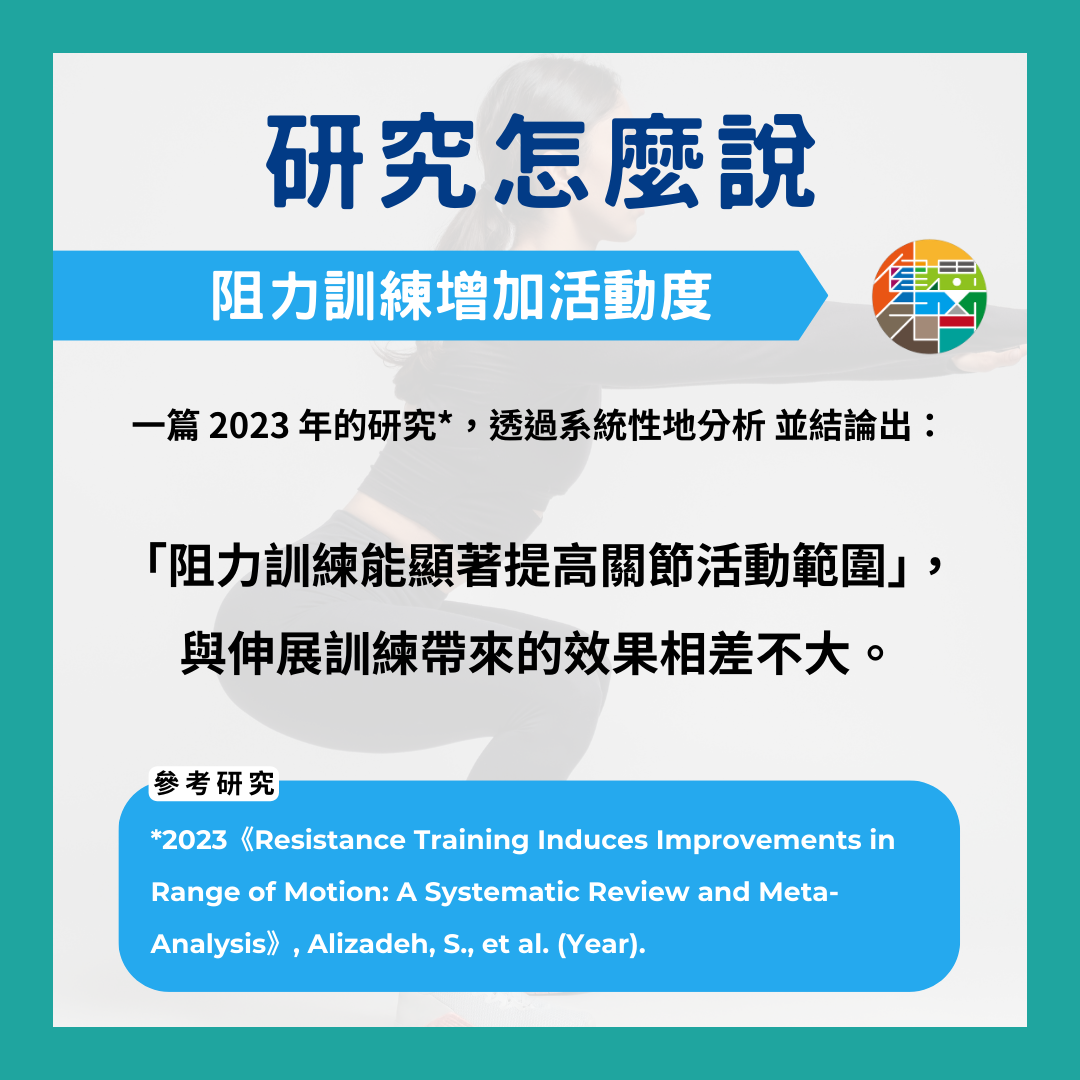 2023 年《Resistance Training Induces Improvements in Range of Motion: A Systematic Review and Meta-Analysis》這篇研究系統性地分析 55 篇相關研究,共涉及 2756 名參與者,年齡範圍從 8 歲到 78 歲。研究結果顯示,「阻力訓練能顯著提高關節活動範圍」,意味著進行阻力訓練後,可能不需要額外的靜態伸展來增強柔韌性。