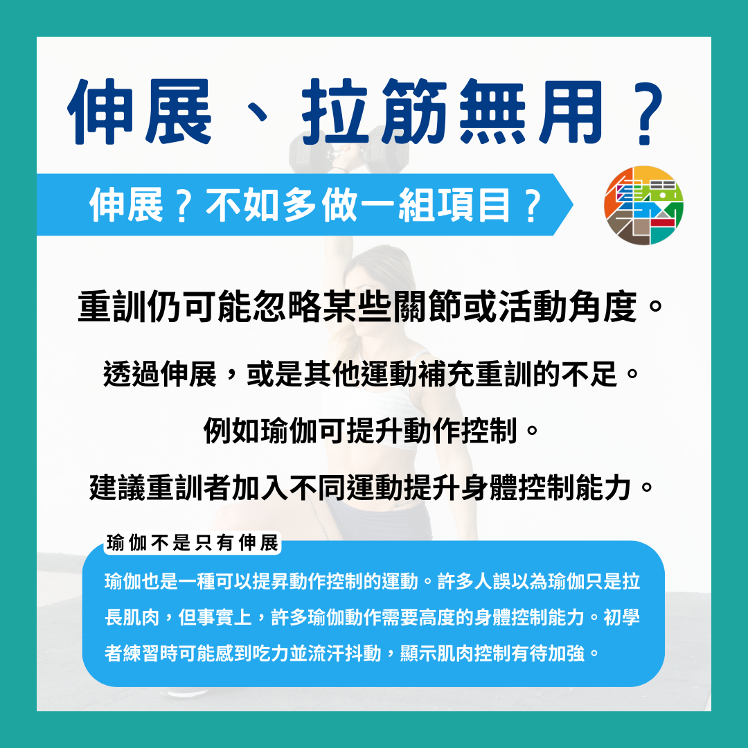根據 2023 年的研究,重量訓練能顯著提高關節的活動度,不一定需要透過額外的伸展來增加活動度。但是,如同小強教練所言,重訓不代表所有關節和角度都能照顧到,而伸展運動或是瑜伽則有助於補足重訓沒能照顧到的部位,提昇該動作的動作控制能力。