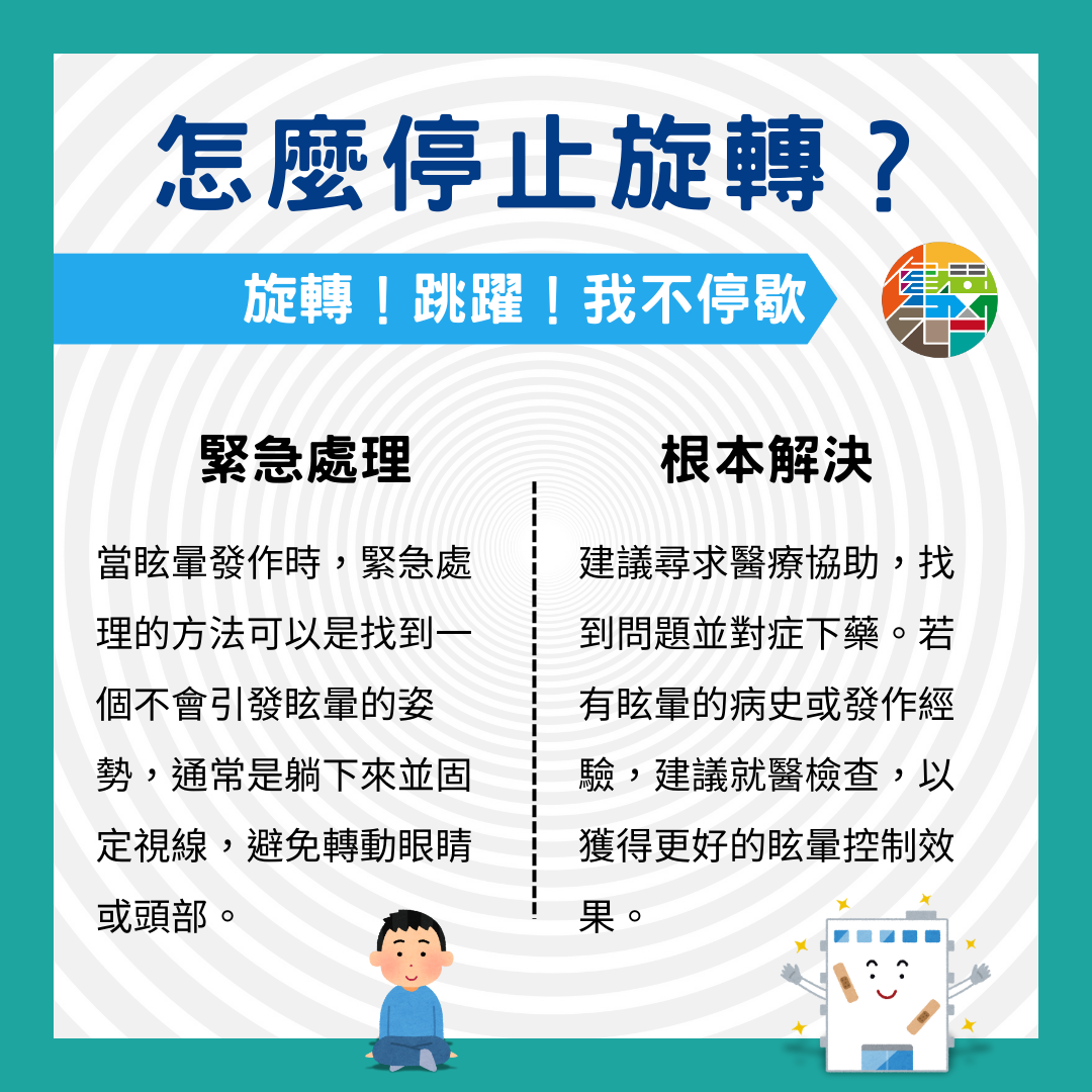當眩暈發作時,緊急處理的方法可以是找到一個不會引發眩暈的姿勢,通常是躺下來並固定視線,避免轉動眼睛或頭部。
