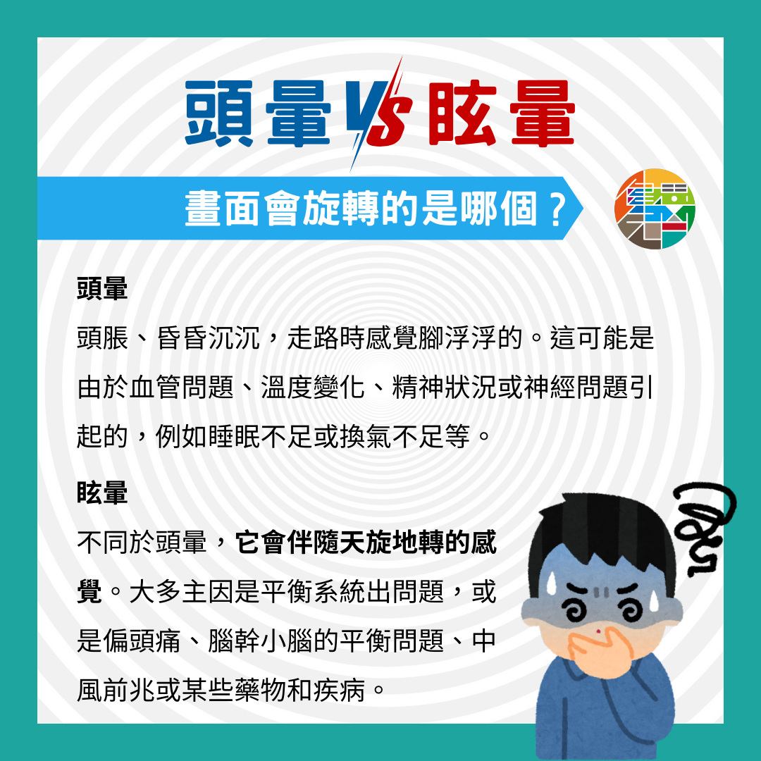 眩暈則不同於頭暈,它會伴隨天旋地轉的感覺。例如,在經歷眩暈時,睜開眼睛可能會看到眼前景物在旋轉。這通常是因為平衡系統出了問題,如耳石脫位、前庭神經發炎、內耳淋巴液體壓力過高等。其他可能原因還包括偏頭痛、腦幹小腦的平衡問題、中風前兆或某些藥物和疾病。