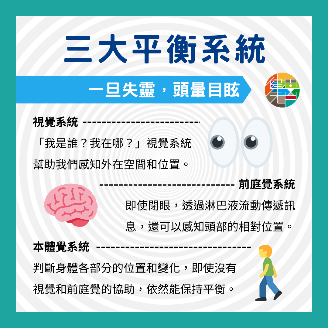 面對突如其來的頭暈狀況,我們可以做什麼緊急處理?要知道怎麼處理,就先來認識幫我保持平衡的三個「支柱」: