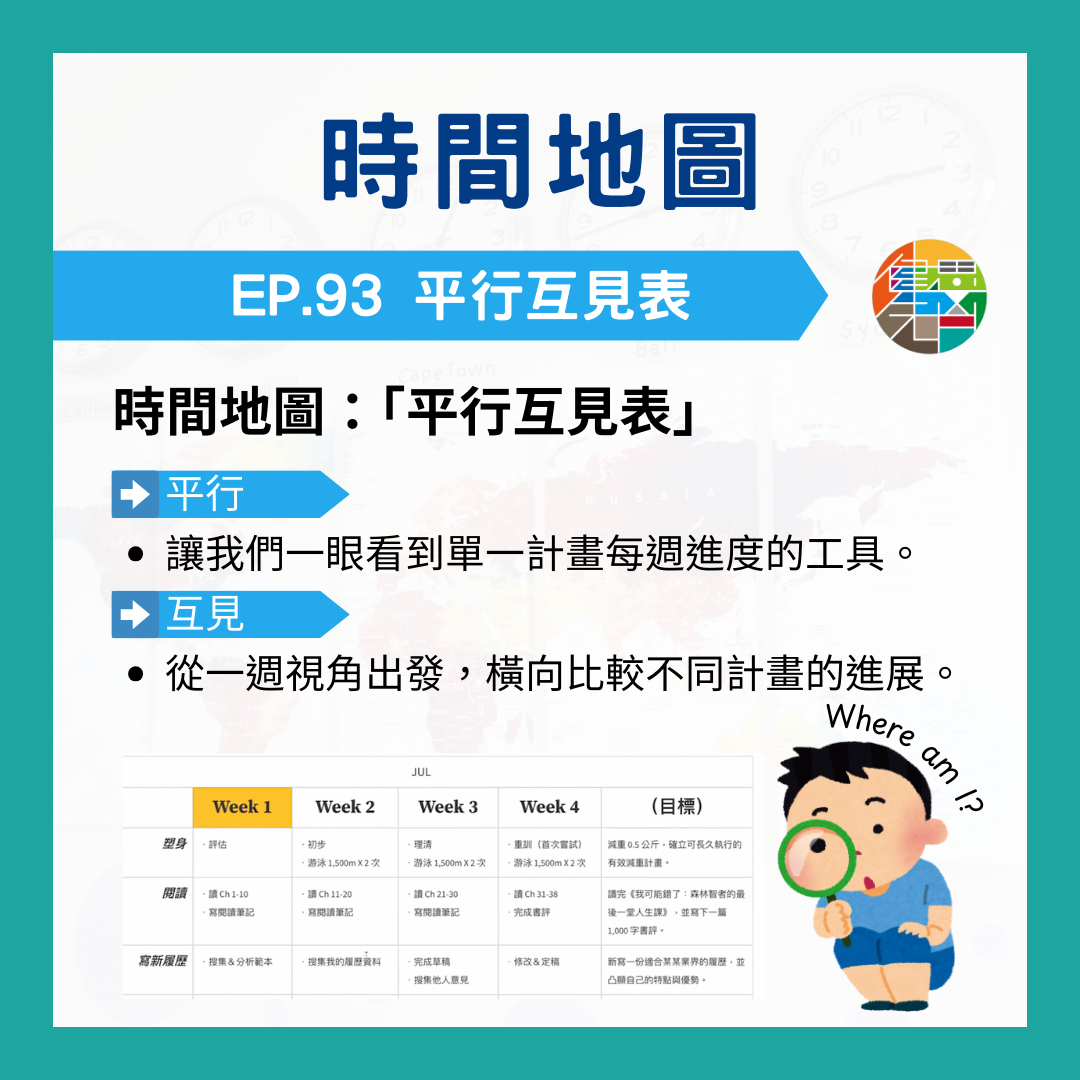 我們在 EP.93 集中介紹了「平行互見表」。這個表格對於創業者來說,就像時間地圖一般,顯示此時此刻你在事業路上的哪個位置、即將要往哪裡去、及現在你要做什麼事情,以及眼前事情是為了什麼目標而做。