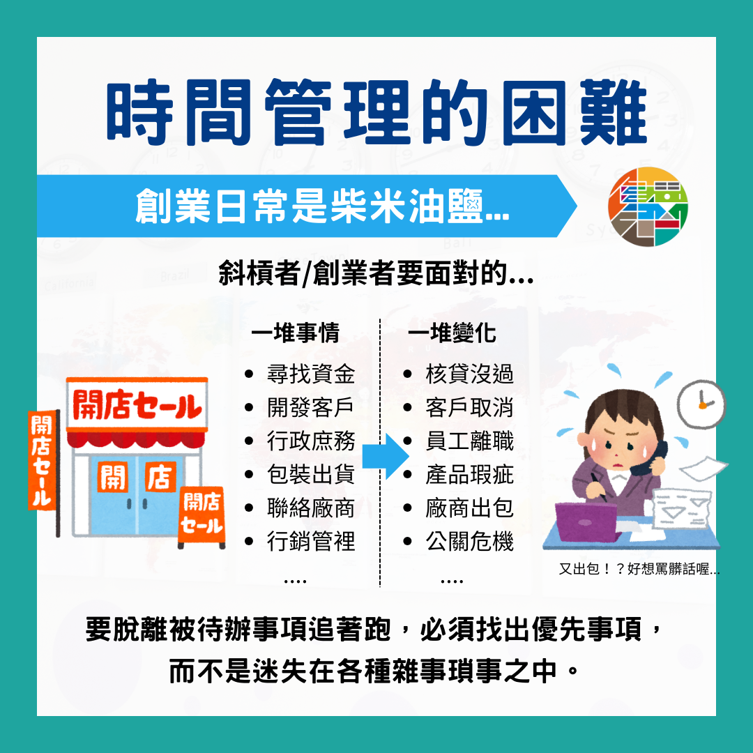 無論是斜槓或是創業者,每天都要處理一堆事情:找錢、見客戶、行政庶務、包裝出貨、聯絡廠商、行銷管理等等,而且每件事情不見得能夠事先安排好,客戶取消見面、突然多出來的行政庶務、廠商突然出事等等,突發事件層出不窮,原本安排好的時間全部被打亂!