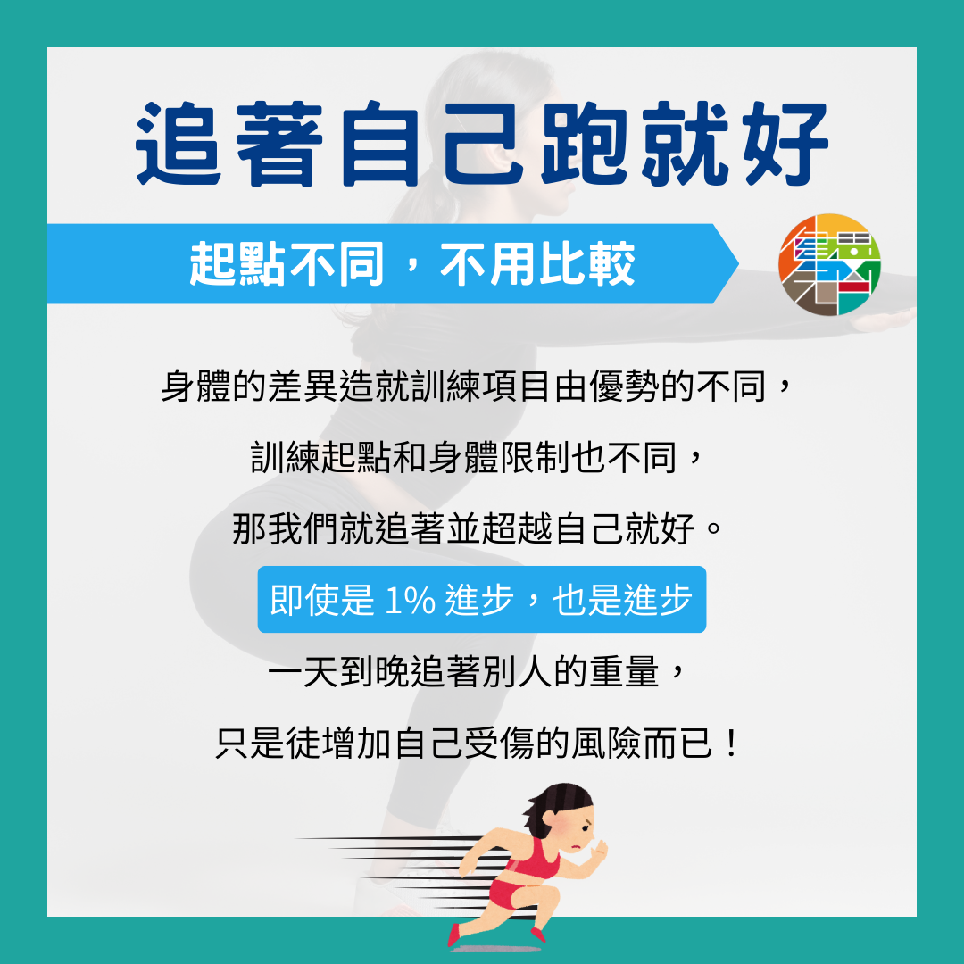 既然我們身體的差異造就訓練項目由優勢的不同,訓練起點和身體限制也不同,那我們就追著並超越自己就好。即使是 1% 進步,也是進步。一天到晚追著別人的重量,只是徒增加自己受傷的風險而已!