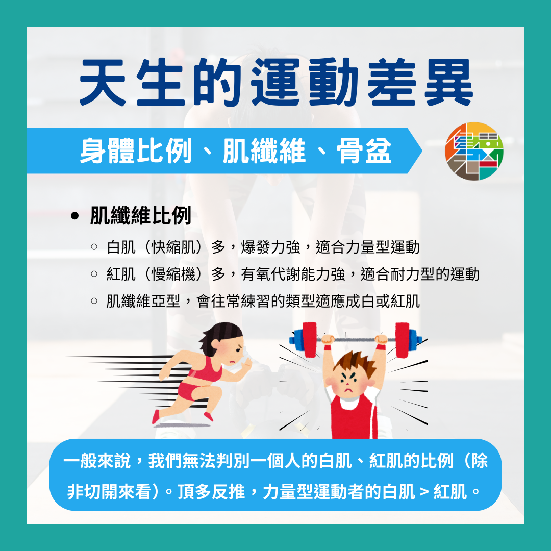 一般來說,我們每個人身上的基纖維比例不會差太多,而且我們也無法先把人剖開在來辦定你適合哪一個項目。但是藉由後天的訓練,可以增加白肌或紅肌的比例。