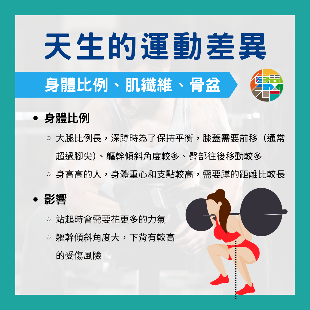 或者,身體比例也會影響運動姿勢的表現。例如,無論身高為何,大腿比例(相對於小腿)較大的人,做深蹲時,膝蓋會需要前移(通常超過腳尖)、軀幹傾斜角度也會比較多、臀部往後移動較多,使得在站起時會需要付出更多力氣,下背也會因為軀幹傾斜角度大而有較高的受傷風險。