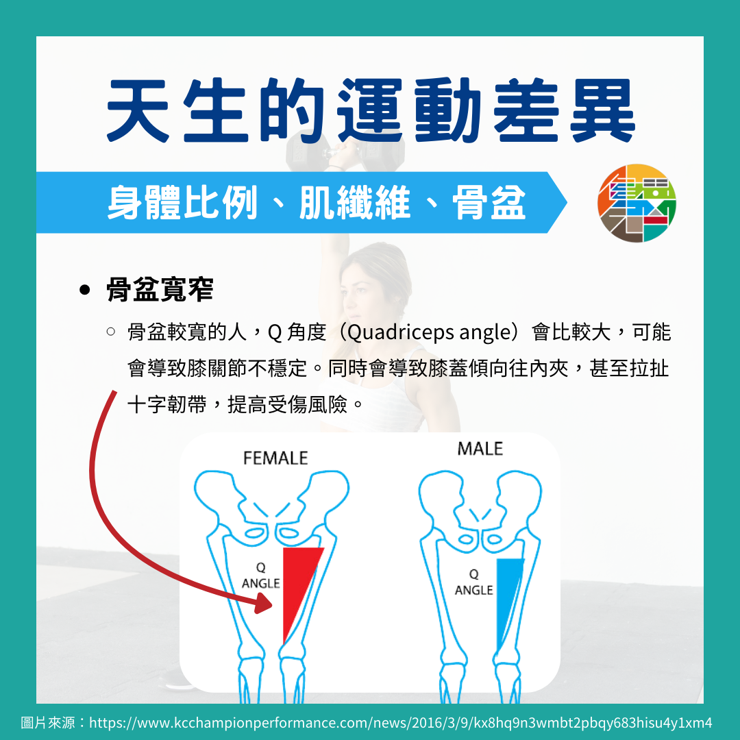 事實是,骨盆較寬的人,Q 角度(Quadriceps angle)會比較大,可能會導致膝關節的不穩定,因為較大的 Q 角會導致膝蓋傾向往內夾,甚至拉扯十字韌帶,提高受傷風險。