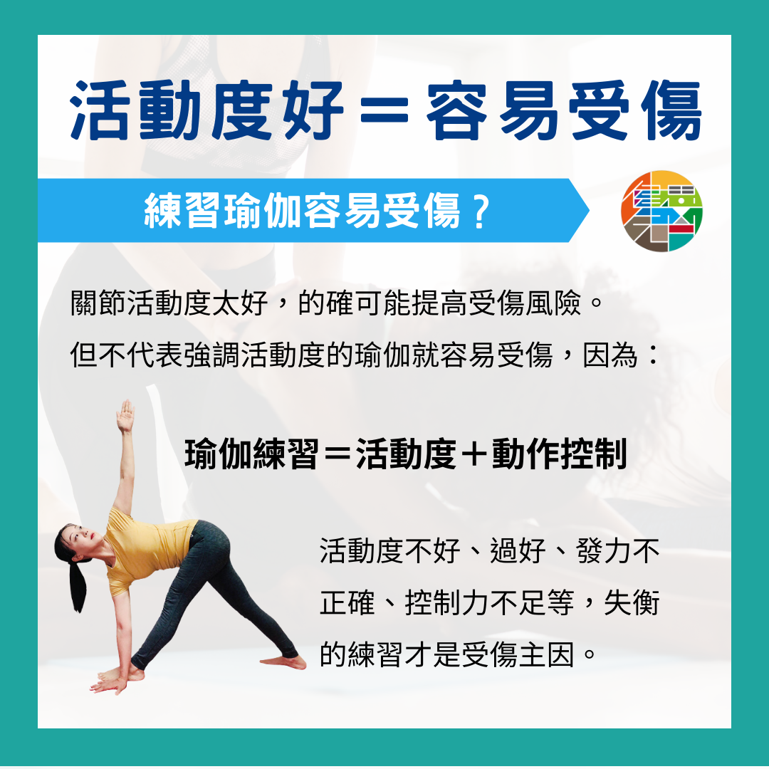 換句話說,瑜伽練習者不僅要活動度,還需要兼顧控制力,達到平衡才能有效預防受傷。