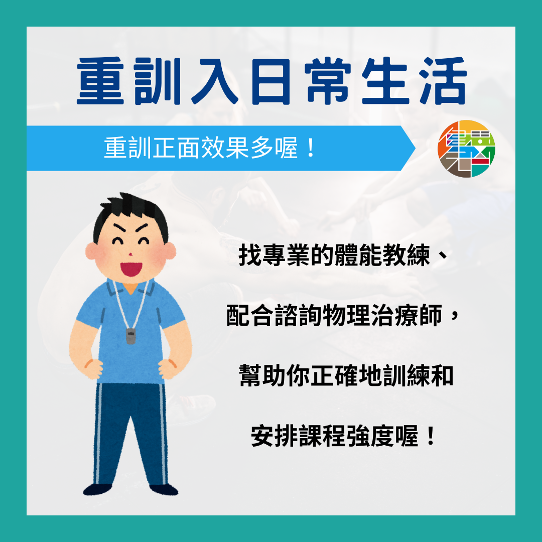 總而言之,既然重量阻力訓練的正面效果很多,就把重訓加入生活日常吧!並且找一位專業的體能教練、配合諮詢物理治療師,幫助你正確地訓練和安排課程強度喔!