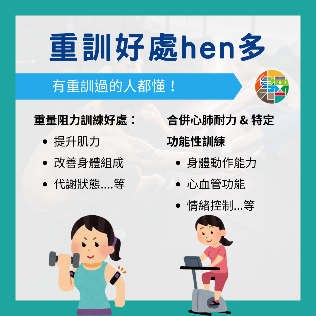 講到重量阻力訓練,可是好處很多:可以提升肌力、改善身體組成與代謝狀態,再合併心肺耐力、特定目的的功能性訓練,更可以改善身體動作能力、心血管功能以及情緒控制等。
