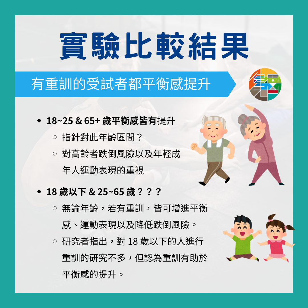 該研究僅鎖定特定族群,蔡老師認為其原因可能是對高齡者跌倒風險以及年輕成年人運動表現的重視。而從大眾觀點來看,願意撥出時間進行重訓,無論年齡區間為何,相信都能有機會增進平衡感、提昇運動表現以及降低跌倒風險。