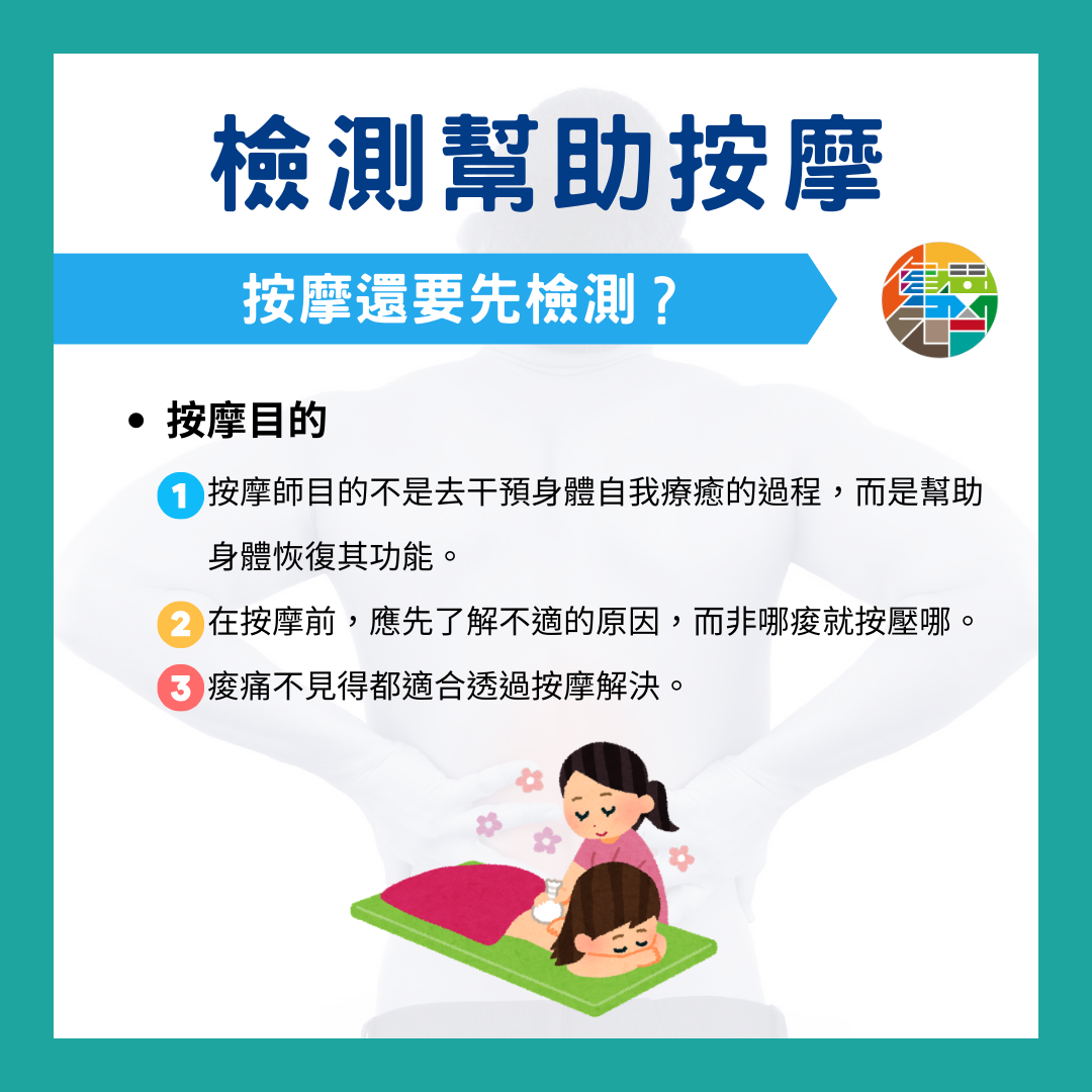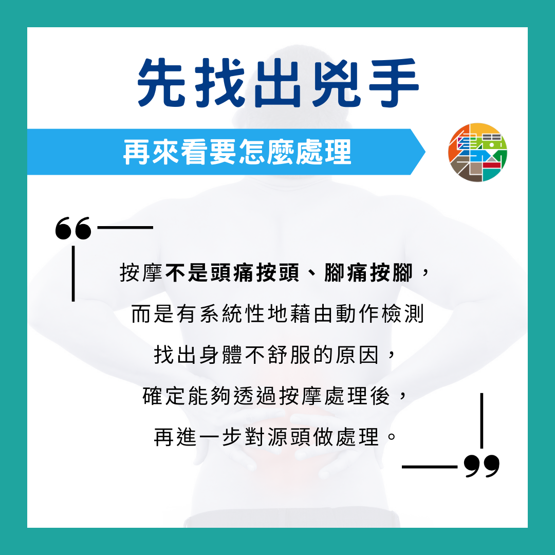 然而,身體痠痛不見得都適合透過按摩解決。這需要按摩師要有能力去判斷的。