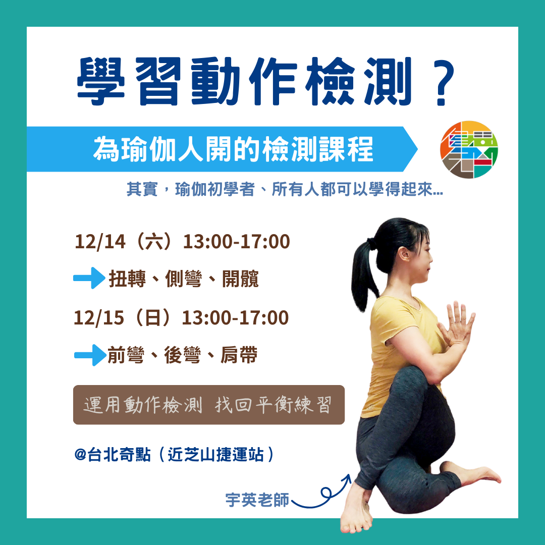 宇英老師將在 12/14(六) 和 12/15(日)的 13:00-17:00,開設動作檢測的基礎課程。在課程中,可以學習到體位法分析,了解完成(瑜伽)體位法所需的關節活動度及其相關的動作檢測、認識肌筋膜鏈並藉由按摩來釋放緊繃的筋膜張力。