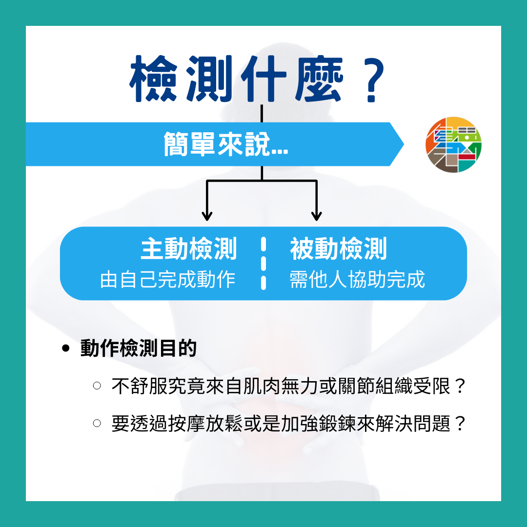 檢測可以簡單分為「主動檢測」和「被動檢測」。主動測試由自己完成動作,被動測試則需他人協助完成。透過動作檢測,可以幫助我們判斷: