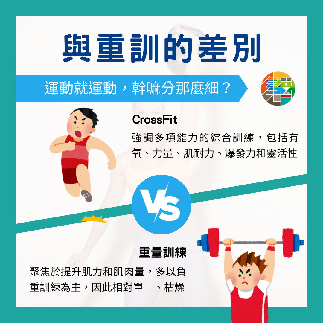 相較於 Crossfit 強調多項能力的綜合訓練,包括有氧、力量、肌耐力、爆發力和靈活性,重訓聚焦於提升肌力和肌肉量,運動動作設計上多以負重訓練為主,因此相對單一,有些人可能認為重訓較為枯燥。