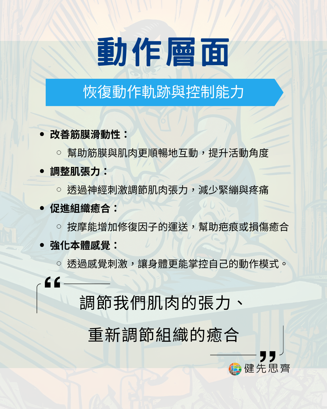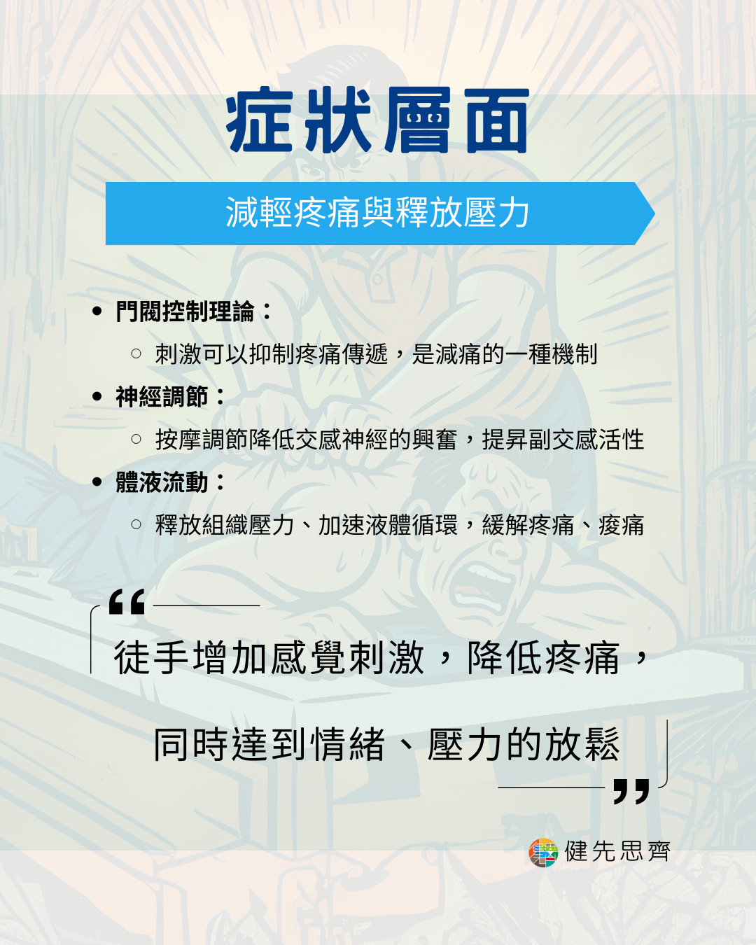 從兩個層面來說明「按摩為何有效」:症狀層面與動作層面