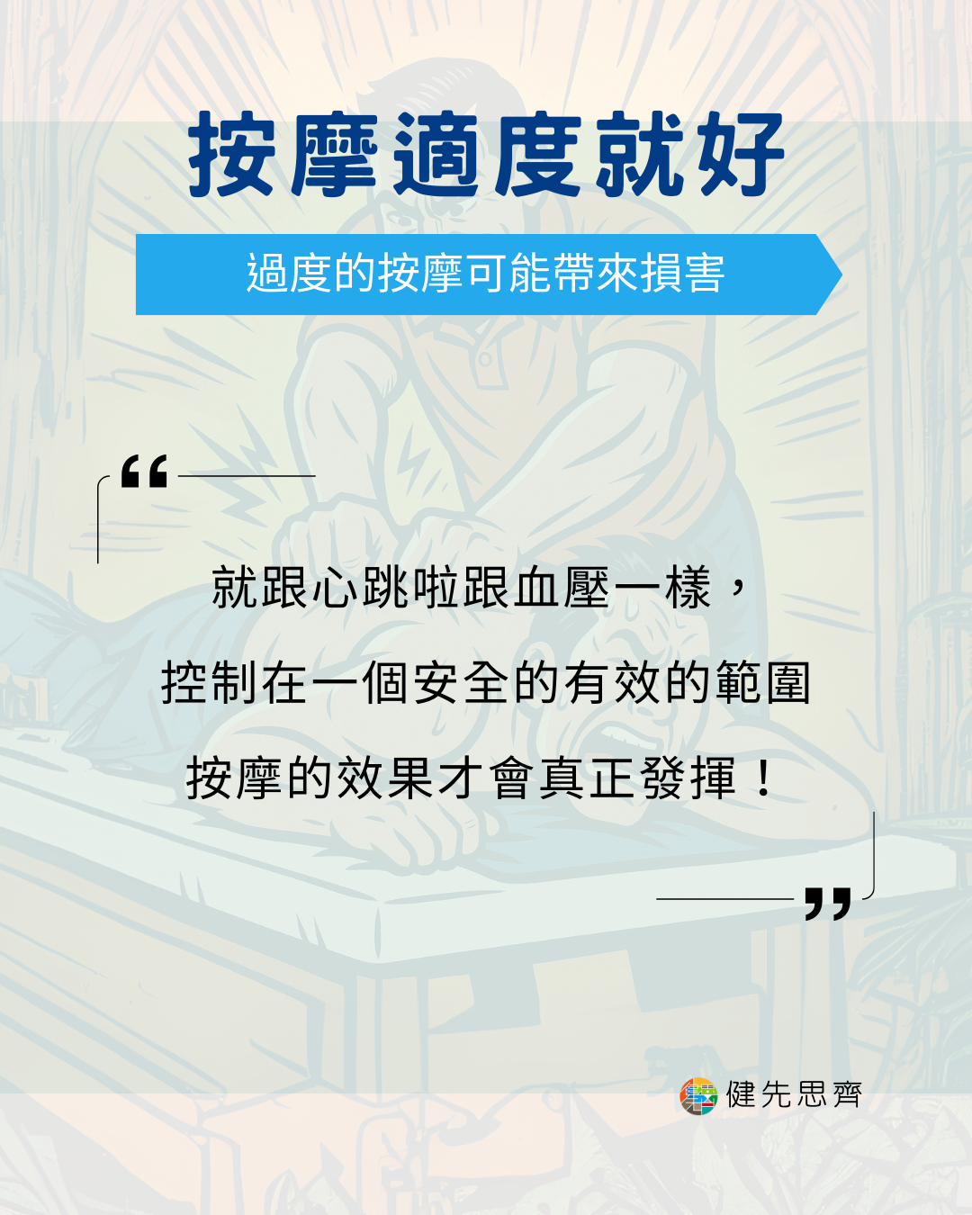 當有些人追求按摩的「爽感」時,容易越按越大力,用力過頭的結果可能會是組織破損、液體滯留導致壓力上升,乃至活動能力下降。正確的觀念是「控制在一個安全的有效的範圍」內即可,按摩的效果才會真正發揮!