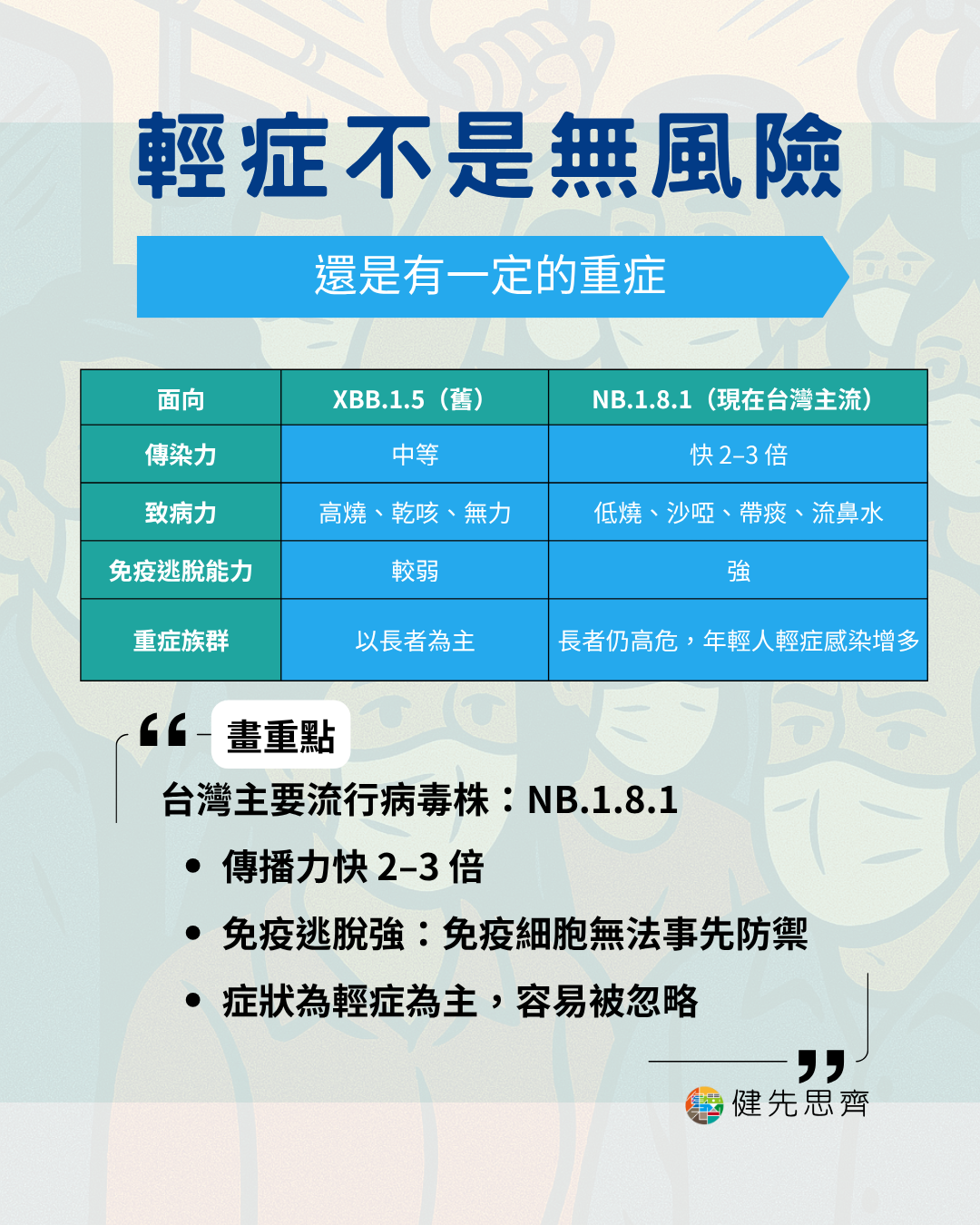 而且這次流行 Covid 症狀是輕症為主(低燒、沙啞、流鼻水等),很容易被當做感冒而忽略篩檢、治療和最重要的預防,對於高風險者都非常的不利!