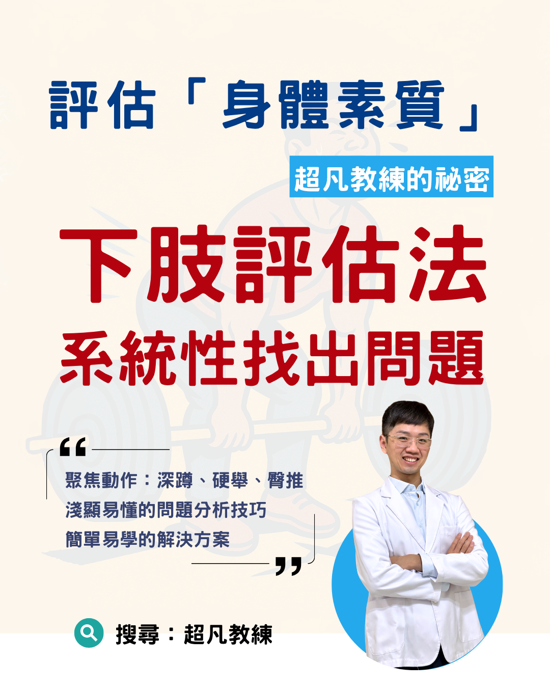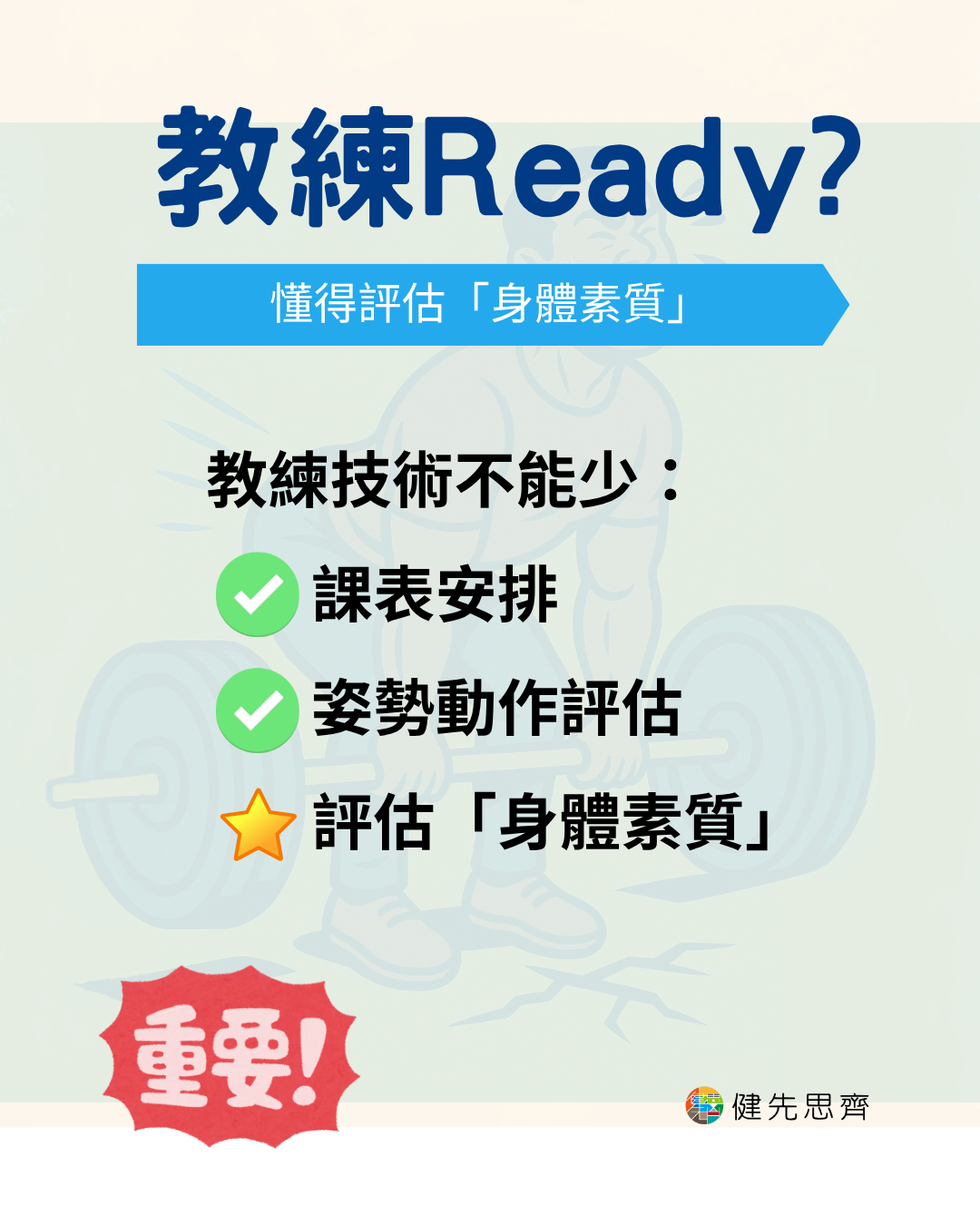 無論是自主訓練的人或是訓練學員的教練,若能在訓練前能做好「系統性評估」加以判斷身體的概況,再依據身體的「等級」來開始訓練,讓每次訓練都是安全且是有效率的!