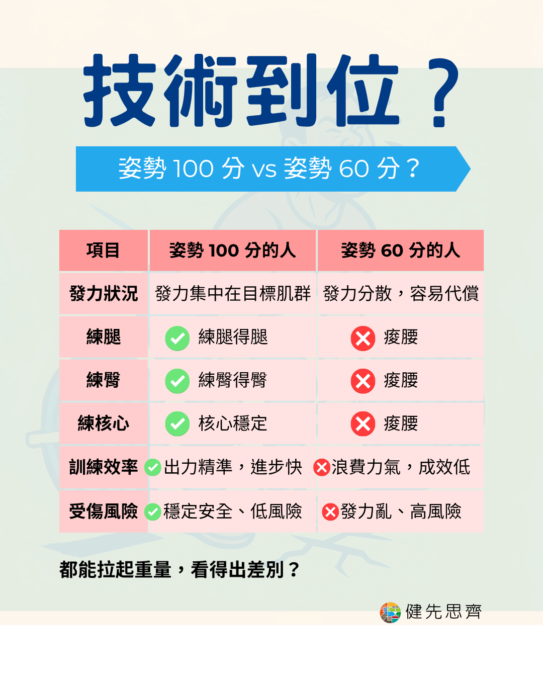 而姿勢 60 分的人,則容易在訓練時出現「錯誤發力」,練腿痠腰、練臀痠腰、練核心還是痠腰。如果觀念不足,可能這些痠痛代表進步。不但浪費力氣,還大幅提高受傷風險。