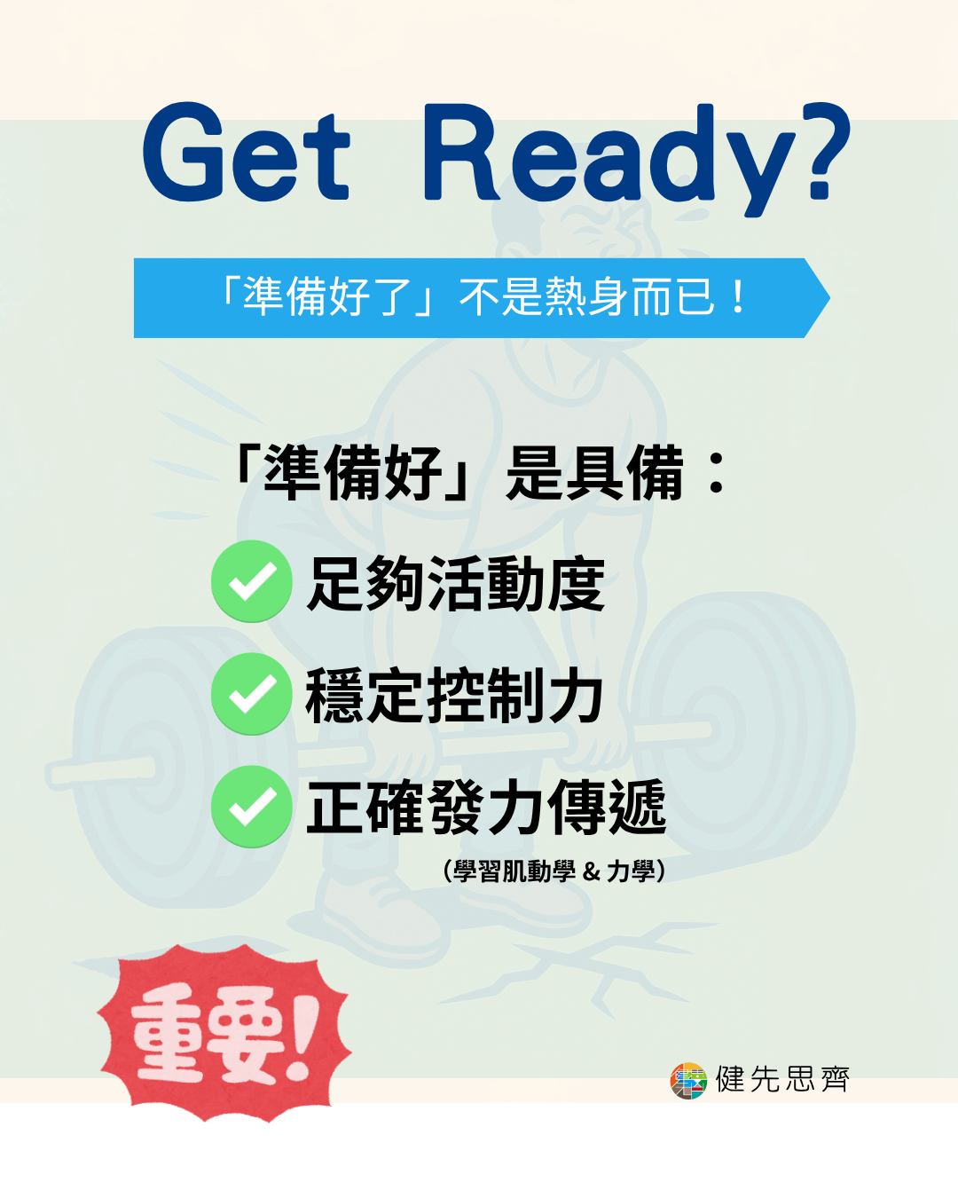 「完整熱身不就好了?」所謂「身體準備好」,不只是體溫升高而已,而是你的身體是否已具備該動作所需的: