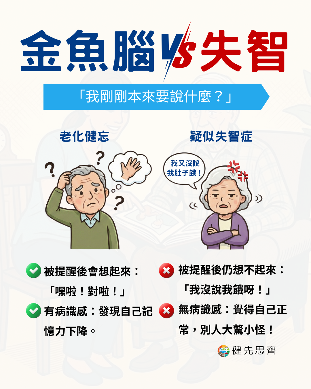 健忘:一時忘記事情,但經提醒或一段時間後就會想起來;會自己意識到「我最近記憶力變差」,具有「病識感」。