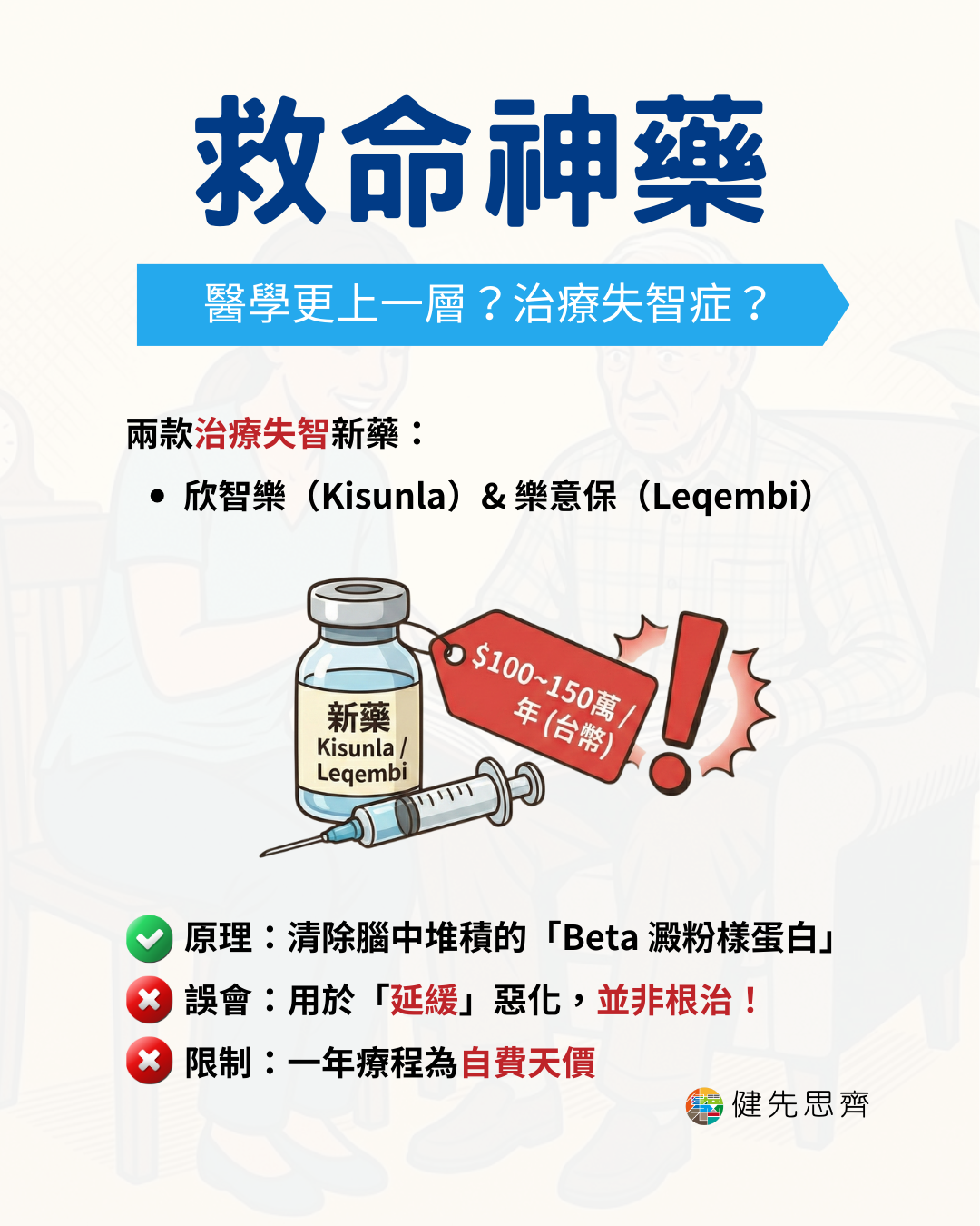 並非根治,而是延緩:這類藥物屬於單株抗體,主要作用是清除腦中堆積的「Beta 澱粉樣蛋白」,延緩神經元受損,但無法讓死去的細胞復活。