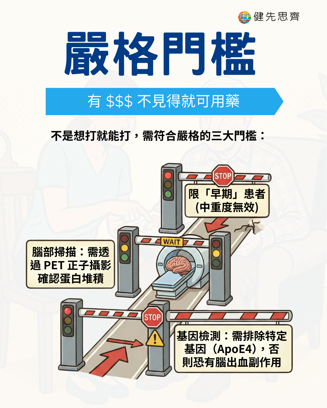 條件嚴格:僅適用於「早期」阿茲海默症患者。使用前需經過正子斷層掃描(PET)確認蛋白堆積,並進行基因檢測(排除特定易腦出血基因型),才能符合用藥資格。