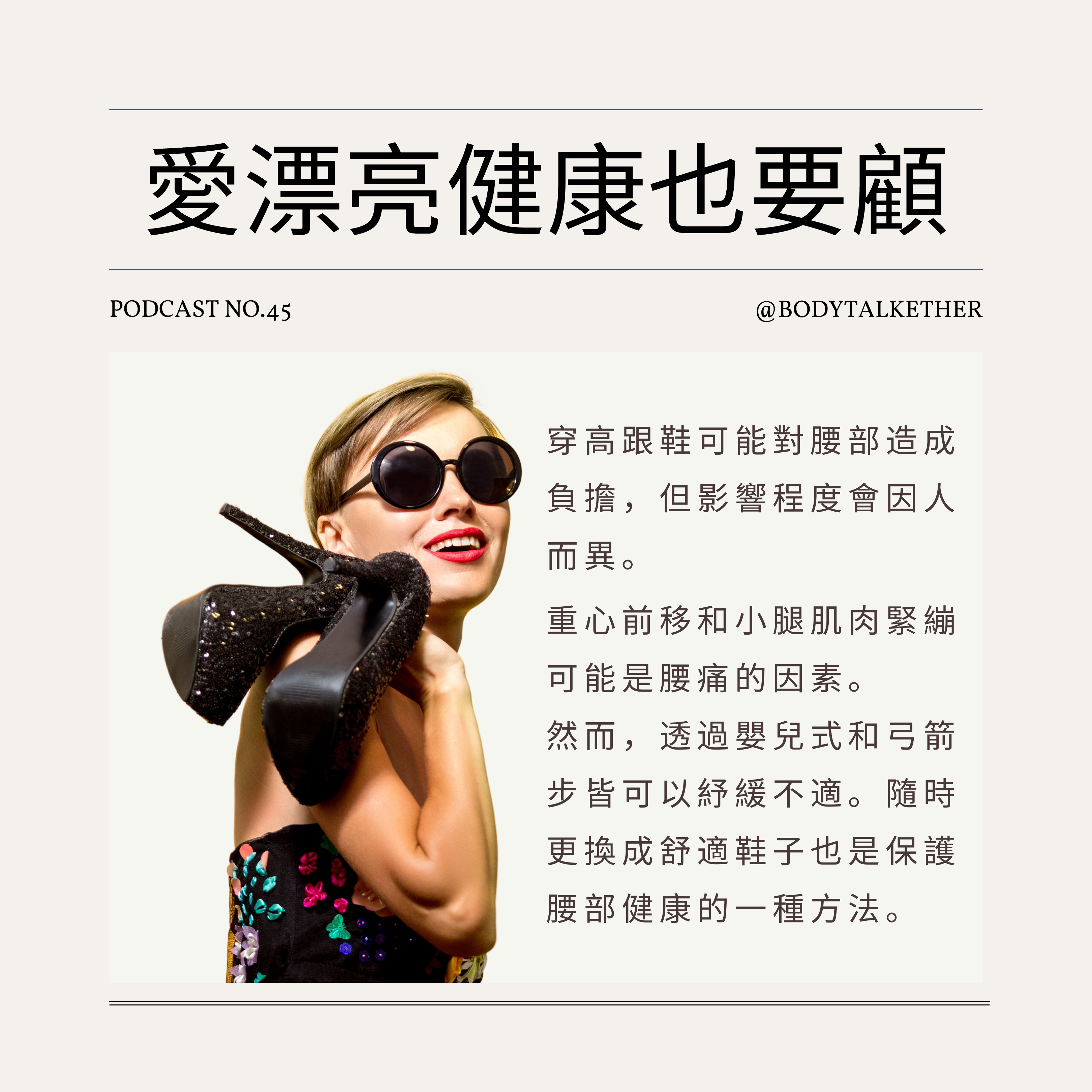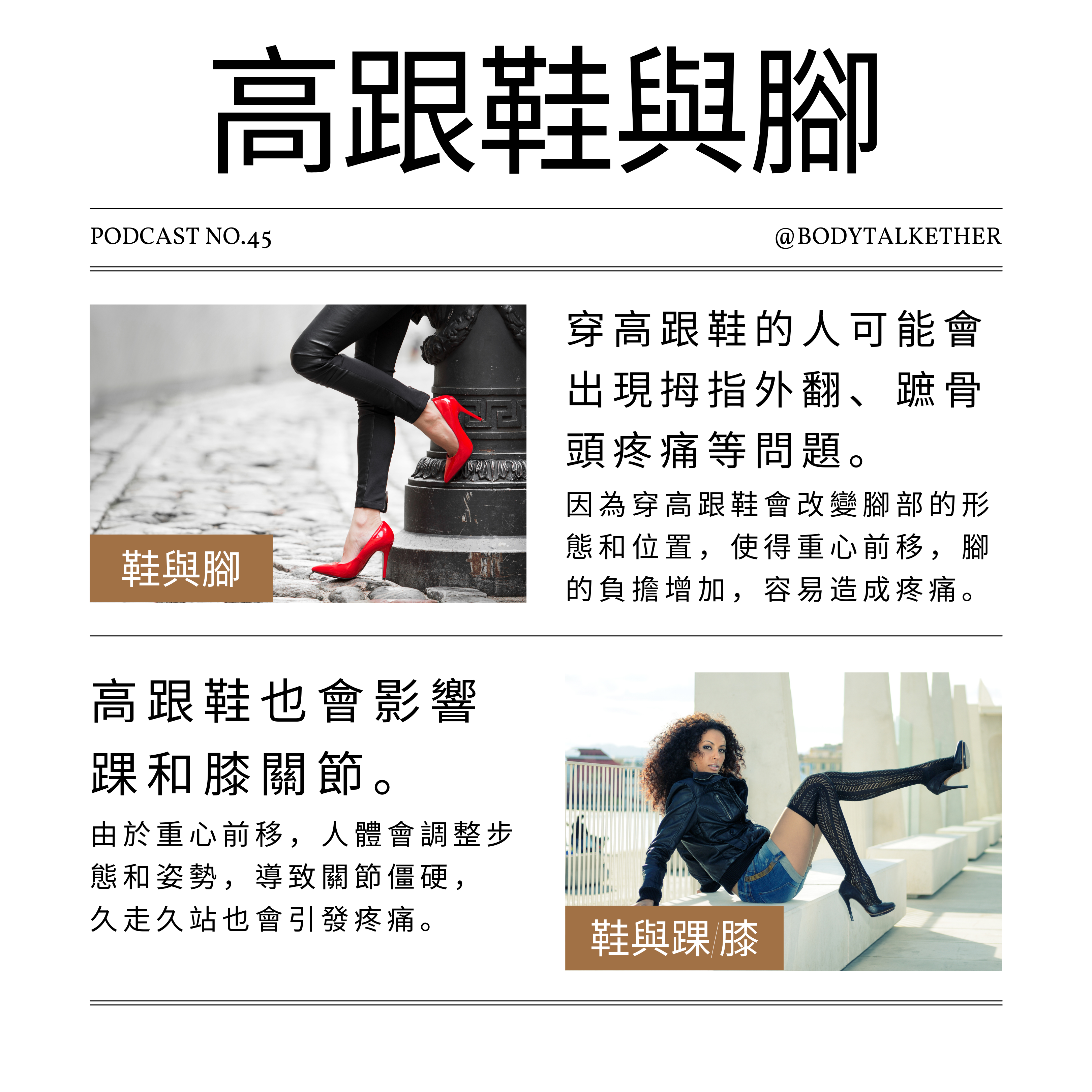 你知道嗎?今天是高跟鞋日(International High Heels Day),我們來聊聊穿高跟鞋是否會對腰造成影響。穿高跟鞋是很多女性喜愛的時尚元素之一,但同時也引起了腰痛等健康問題的擔憂。這一集 Podcast 將從下肢的角度、研究結果和穿高跟鞋可能造成腰痛的因素三個方面探討高跟鞋和腰痛的關係,並提供一些紓緩疼痛的方式。