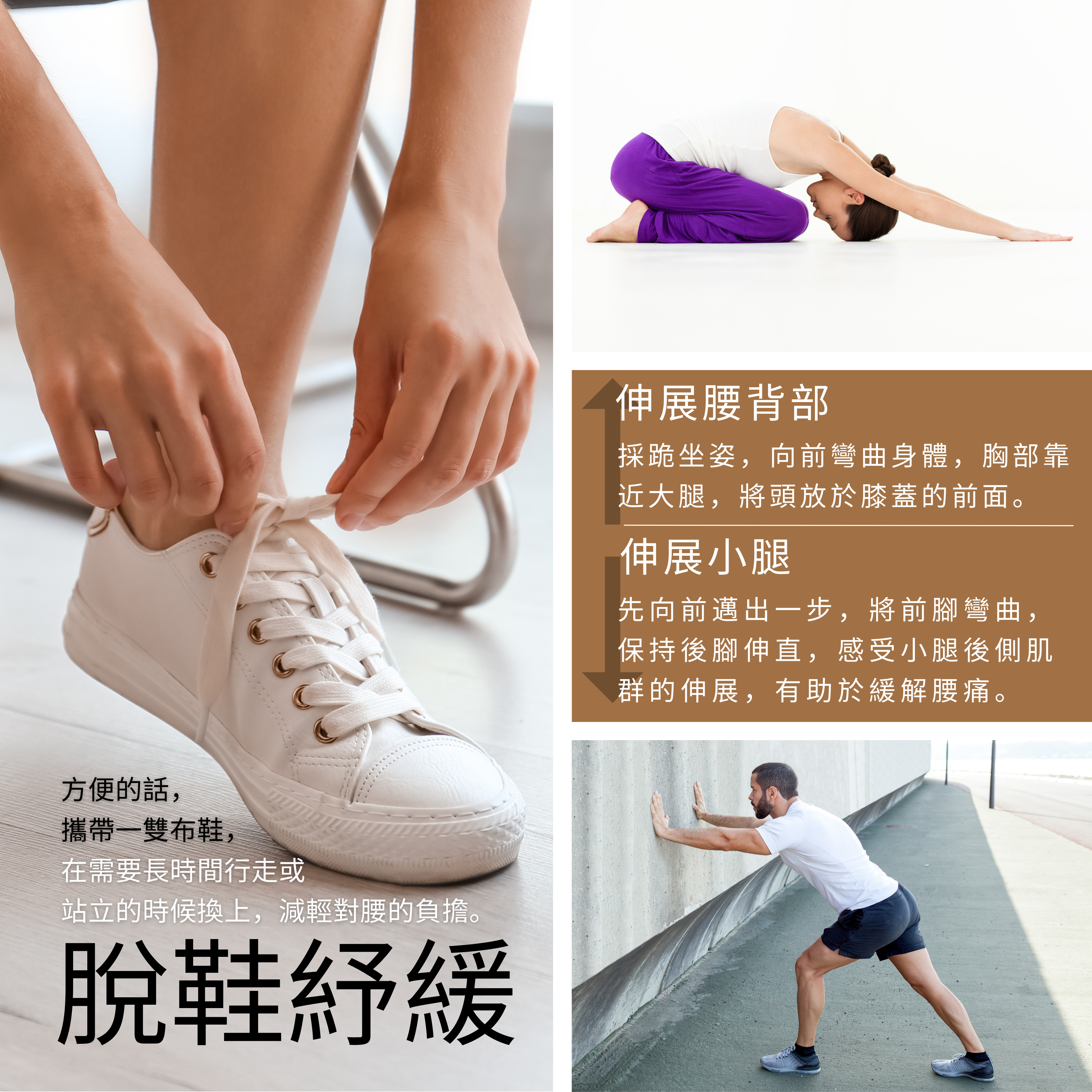 👠 隨時更換鞋子:如果可能的話,攜帶一雙平底鞋,在需要長時間行走或站立的時候換上,減輕對腰的負擔。