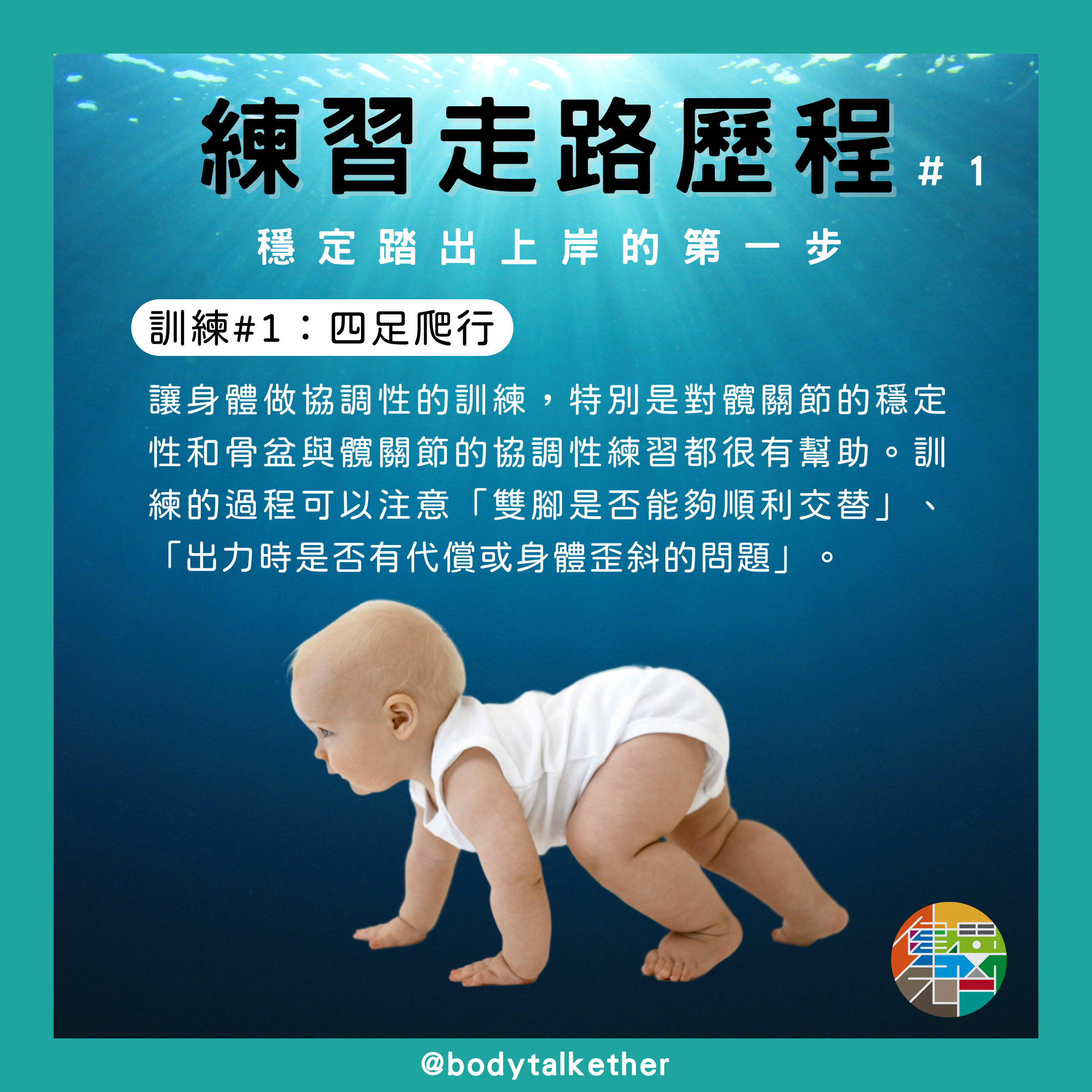 為了幫助 Ariel 新的移動方式,針對上述的挑戰,歐峻邑院長建議透過以下循序漸進的訓練來學習正去使用雙腳走路。