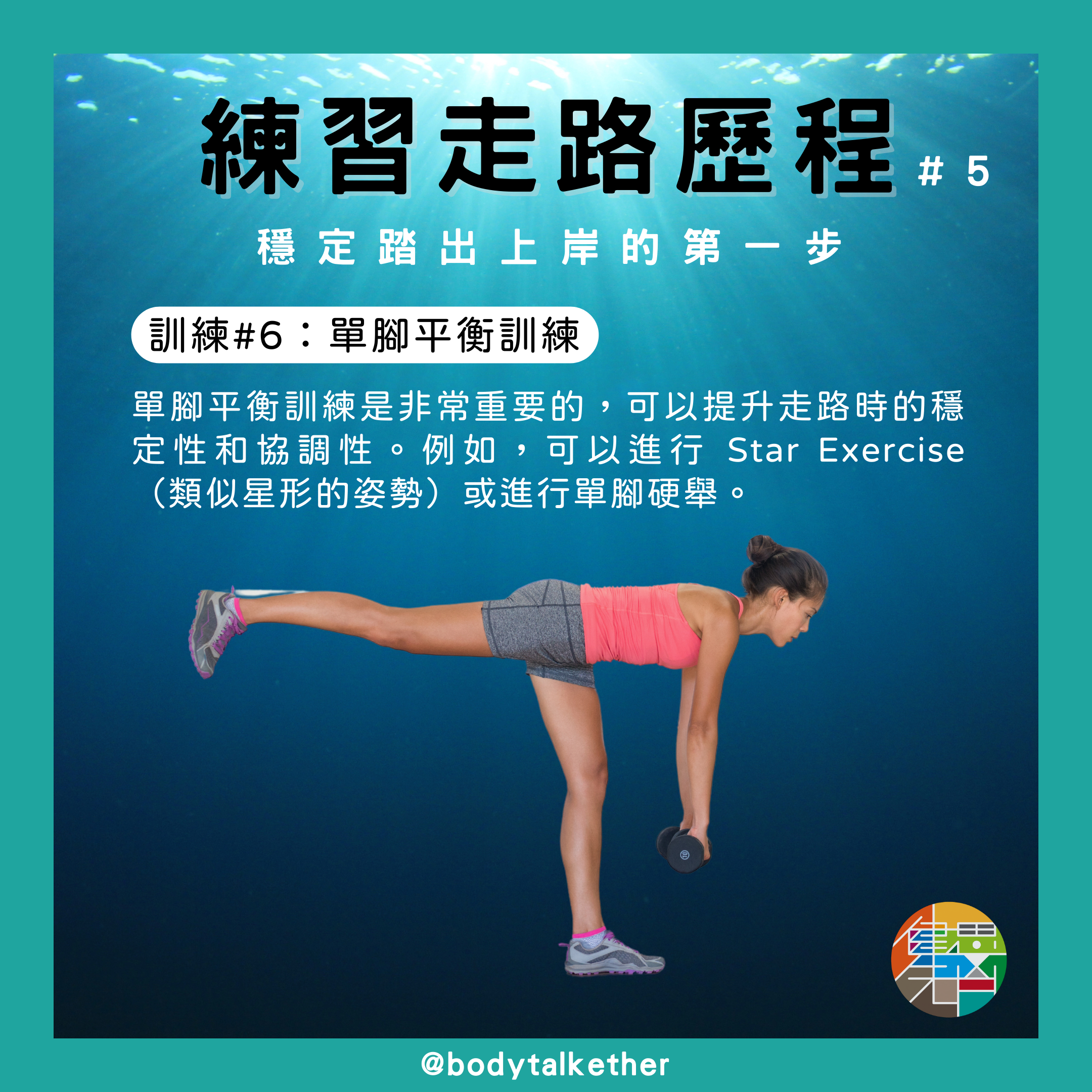 單腳平衡訓練是非常重要的,可以提升走路時的穩定性和協調性。例如,可以進行 Star Exercise(類似星形的姿勢)或進行單腳硬舉。