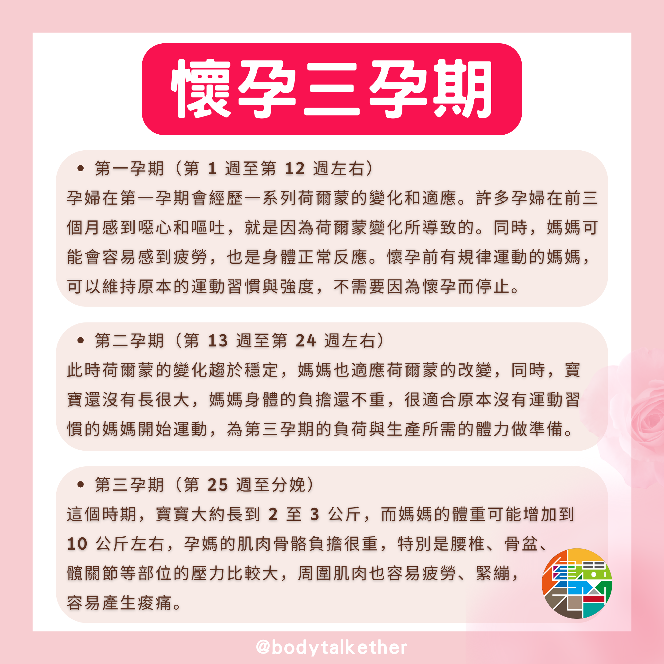 這個時期,寶寶大約長到 2 至 3 公斤,而媽媽的體重可能增加到 10 公斤左右,孕媽的肌肉骨骼負擔很重,特別是腰椎、骨盆、髖關節等部位的壓力比較大,周圍肌肉也容易疲勞、緊繃,容易產生痠痛。