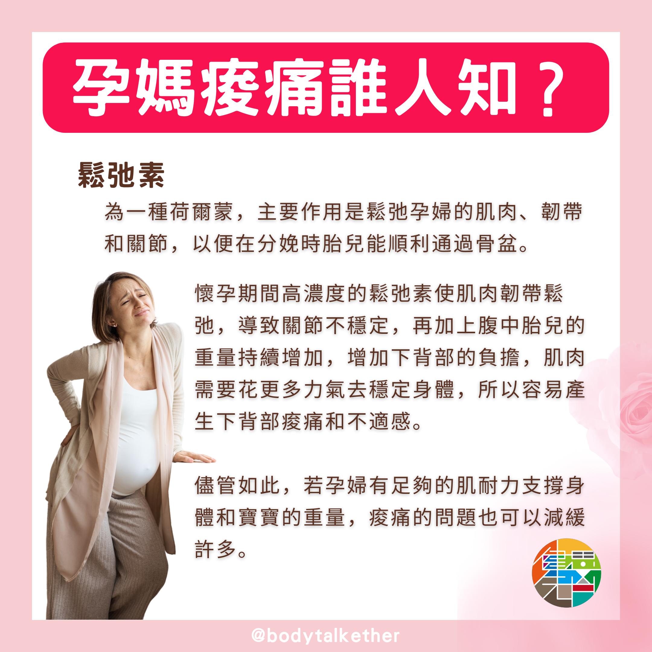 懷孕期間高濃度的鬆弛素使肌肉韌帶鬆弛,導致關節不穩定,再加上腹中胎兒的重量持續增加,增加下背部的負擔,肌肉需要花更多力氣去穩定身體,所以容易產生下背部痠痛和不適感。