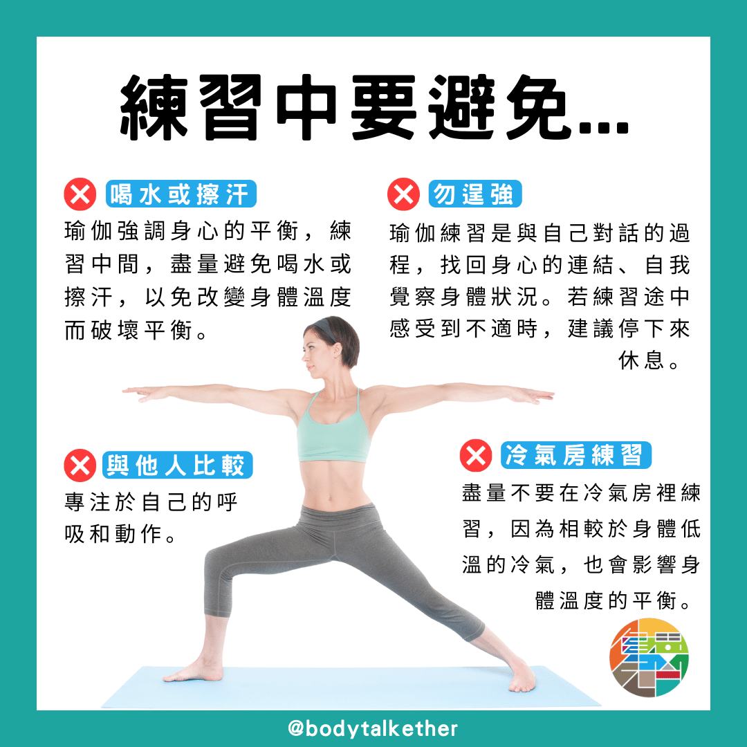 勿逞強、硬做、跟他人比較練習瑜伽時,應專注於自己。此外,每個人的身體條件和每日的身體狀況都不同,所以練習瑜伽時,除了避免強迫自己進行超過自身能力範圍的動作,也不需要跟他人比較,只會徒增壓力和焦慮,並導致受傷。